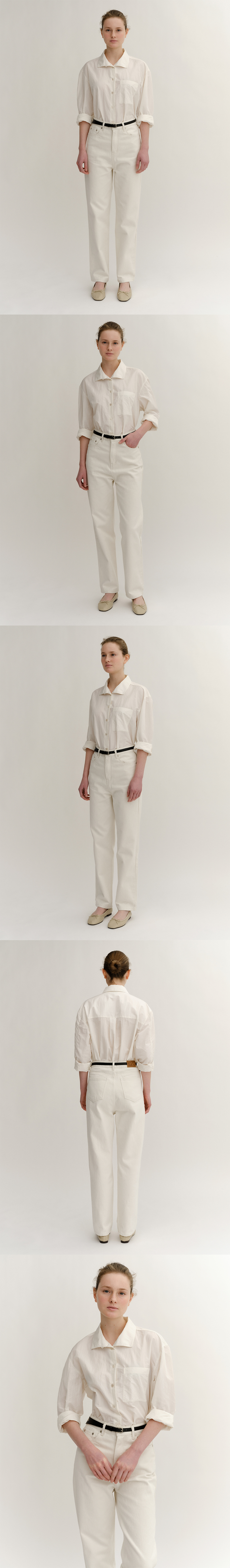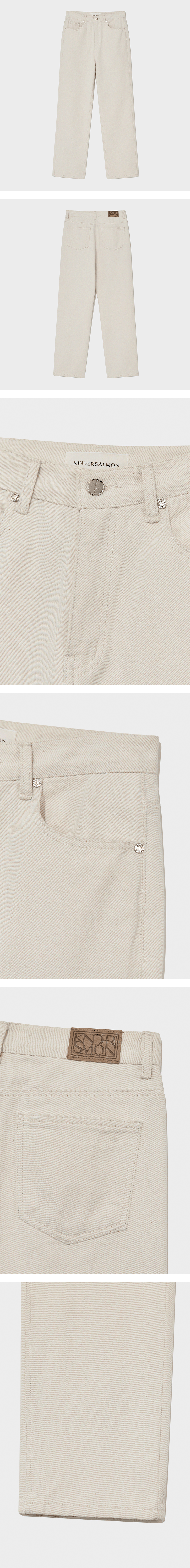 하이웨이스트 코튼 오프 화이트 진. 베이지 실이랑 아이보리 실 이중으로 편직한 이중지 소재, 하이웨이스트 스트레이트 레귤러 핏, 신축성 없음, 5-포켓 클래식 스타일.