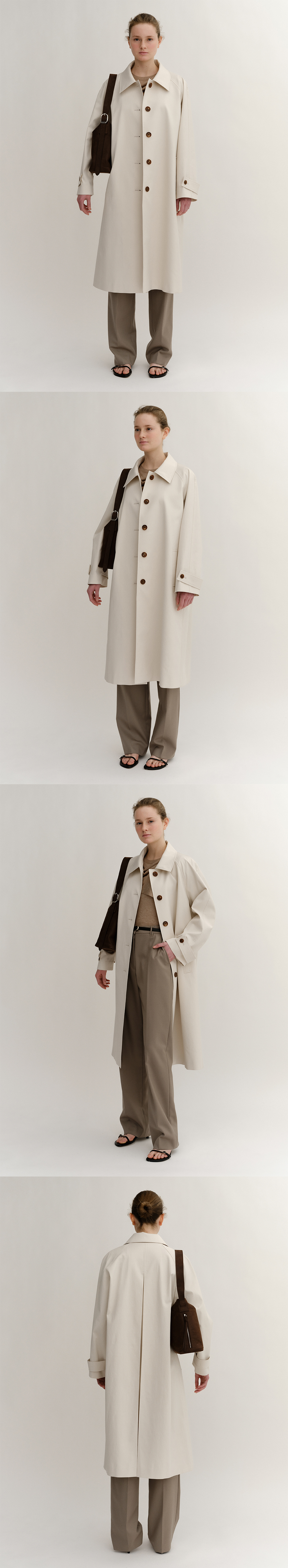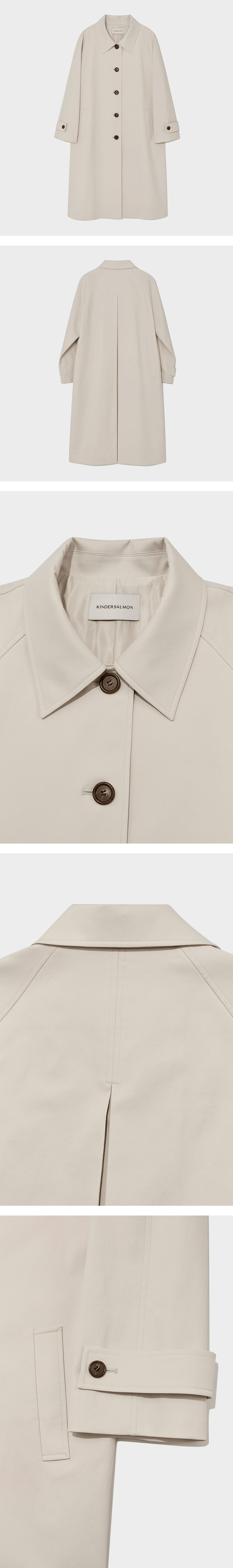 에이라인 실루엣의 면혼방 싱글 코트. 라글란 소매의 싱글 자켓, 에이라인으로 떨어지는 후면 맞주름, 앞면 웰트 포켓, 라펠과 칼라의 전체 ¼ 탑 스티칭 마감.