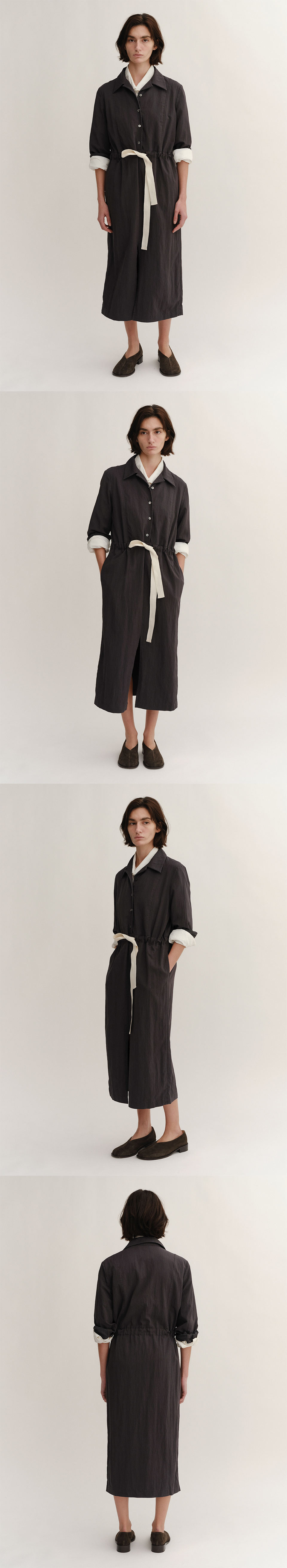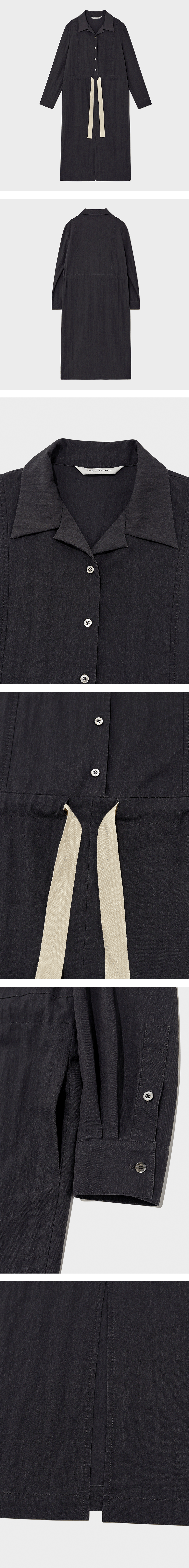셔츠스타일의 롱 드레스. 부드러운 가먼트 다이 바이오 워싱, 앞면 4-버튼 여밈, 자개 버튼 디테일의 플래킷 및 커프스, 웨이스트 스트링 디테일, 앞 중심 트임, 풀 미디 기장의 스트레이트 핏.