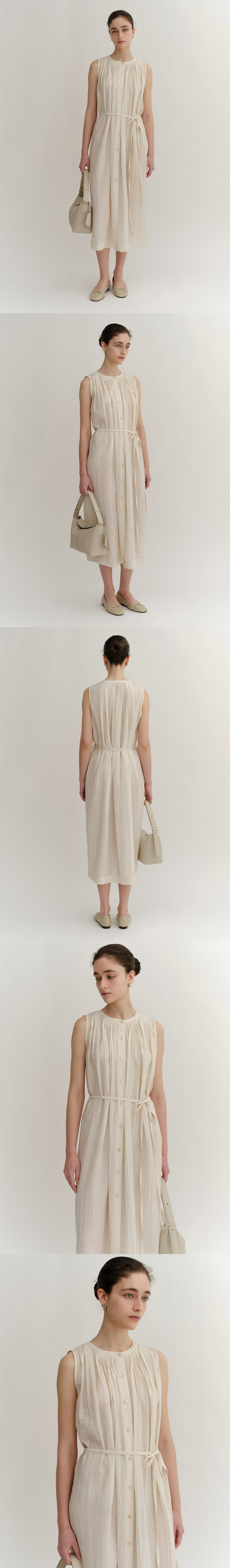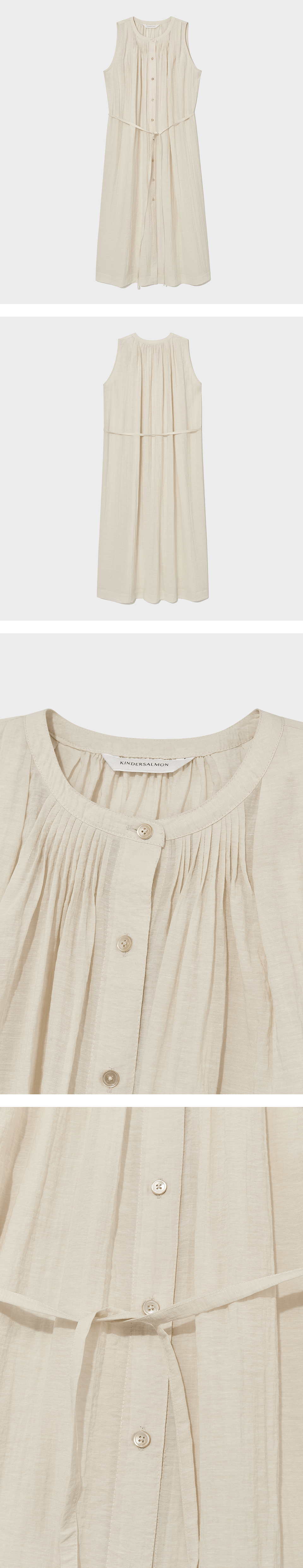 린넨 혼방의 슬리브리스 Carme 셔츠 드레스. 네크라인 핀턱 디테일에서 어깨 중심 쪽으로 연결되는 주름 디테일의 조화,여유로운 A라인 실루엣, 다양한 연출이 가능한 허리 벨트 레이온과 린넨 혼방으로 천연 소재의 청량한 터치감.