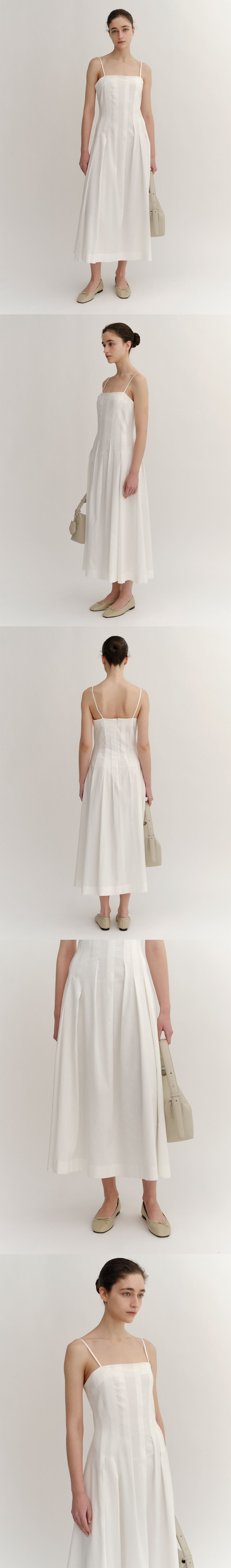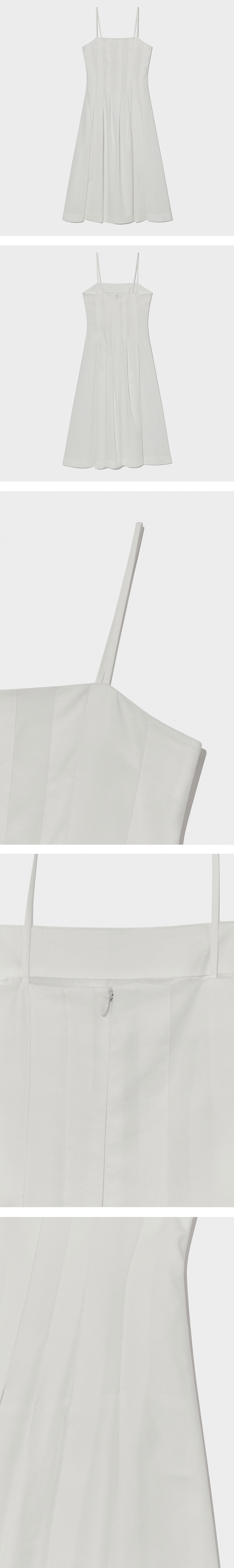 비스코스&면 혼방의 슬리브리스 롱 드레스. 비스코스와 면, 린넨의 교직으로 청량감이 좋고 린넨의 단점인 구김을 보완. 핏 앤 플레어 라인, 후면 히든 지퍼 여밈, 불규칙한 라인의 외주름, 웨이스트 라인에서 피티드 플레어 라인으로 확장되는 실루엣.