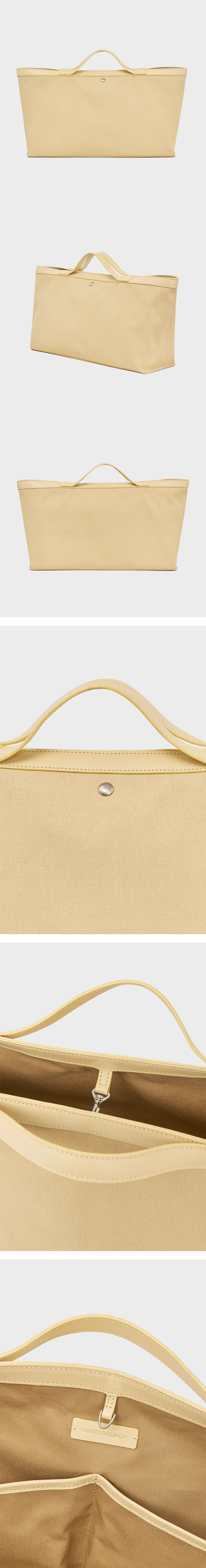 / 출고 일정 안내 본 제품은 재고가 모두 소진되어 리오더에 들어갔으며 8/19일부터 주문 결제 순으로 순차 출고될 예정입니다. 검수 과정에 따라 1-2일 정도 지연될 수 있습니다. 구매하시는데 참고 부탁드리며 상품 출고 지연으로 인해 불편을 드린 점 양해 부탁드립니다. 부드러운 코튼, 폴리 혼방 원단과 소가죽 트리밍. 토트로 착용 가능한 간결한 핸들 디테일. 넉넉한 내부 수납과 2개의 지퍼 포켓. 숄더백으로 캐주얼하게 착용 가능한 디자인.