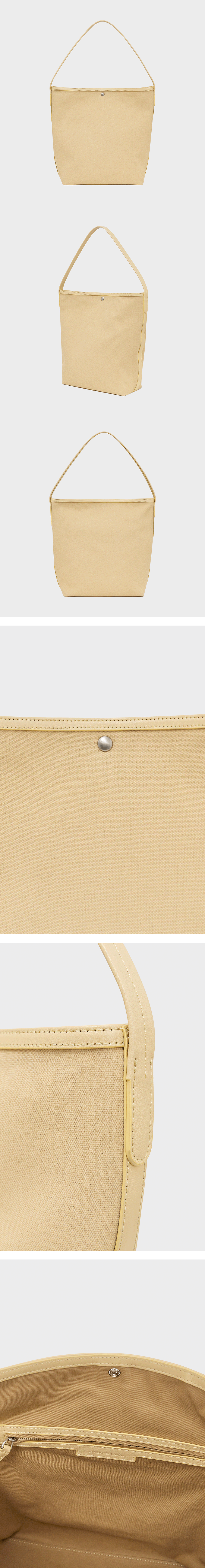 부드러운 코튼, 폴리 혼방 원단과 소가죽 트리밍. 오픈 클로징이 가능한 스냅 장식. 넉넉한 내부 수납과 1개의 지퍼 포켓. 숄더백으로 캐주얼하게 착용 가능한 디자인.