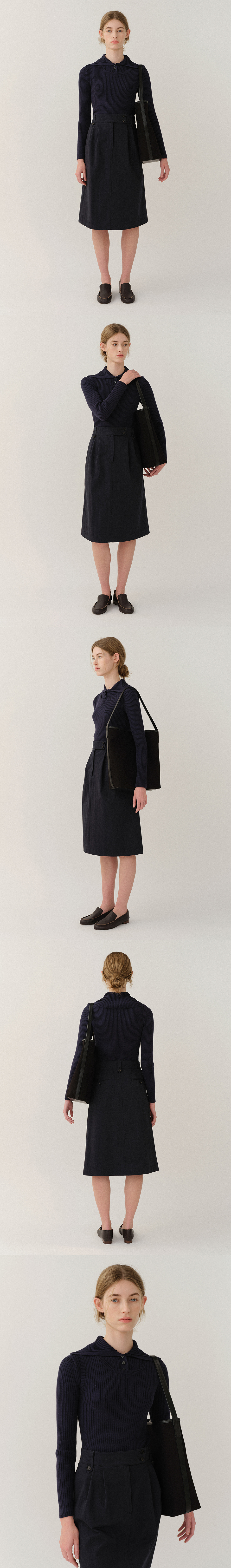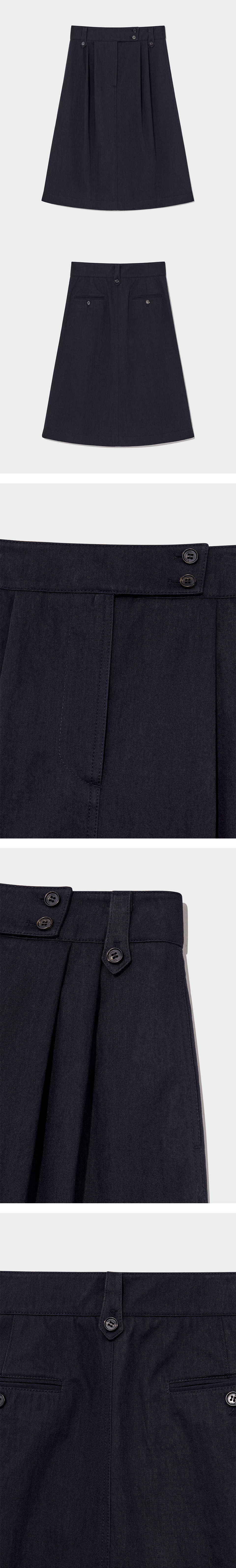 에이라인 코튼 스커트. 무릎 기장, 두 개의 턱 디테일, 스트레이트 칼럼 실루엣, 해진 듯한 효과를 연출하는 바이오 워싱 마감, 앞면으로 위치한 사선 포켓, 소뿔 버튼