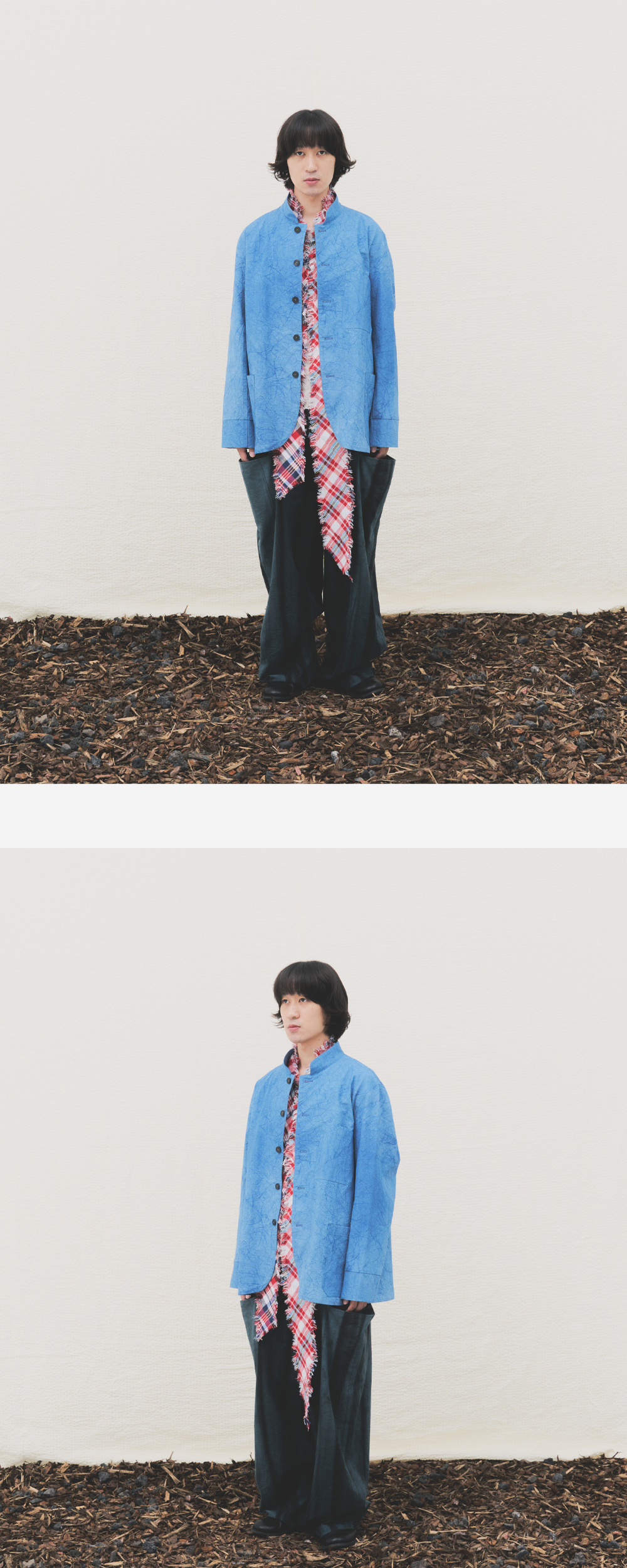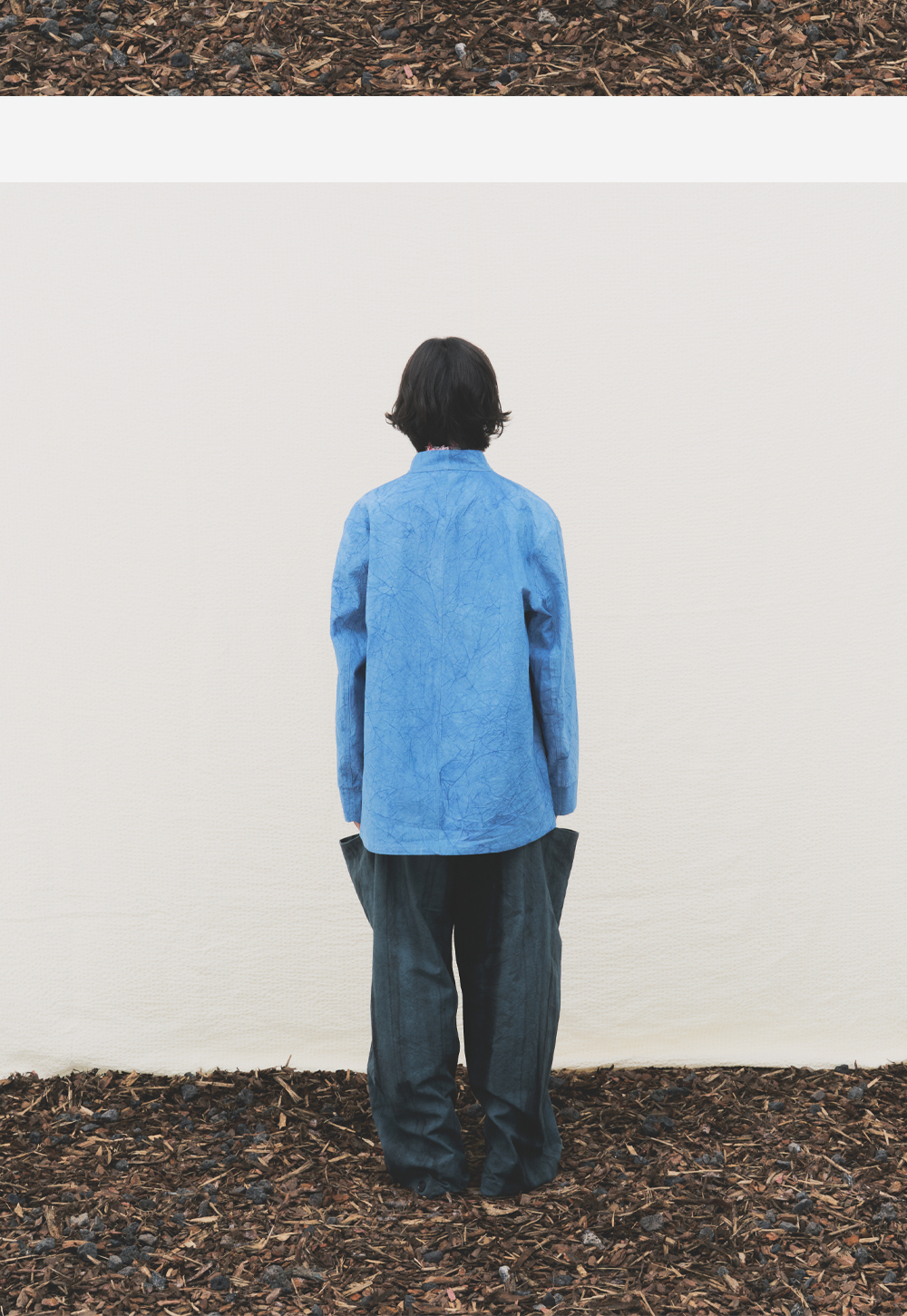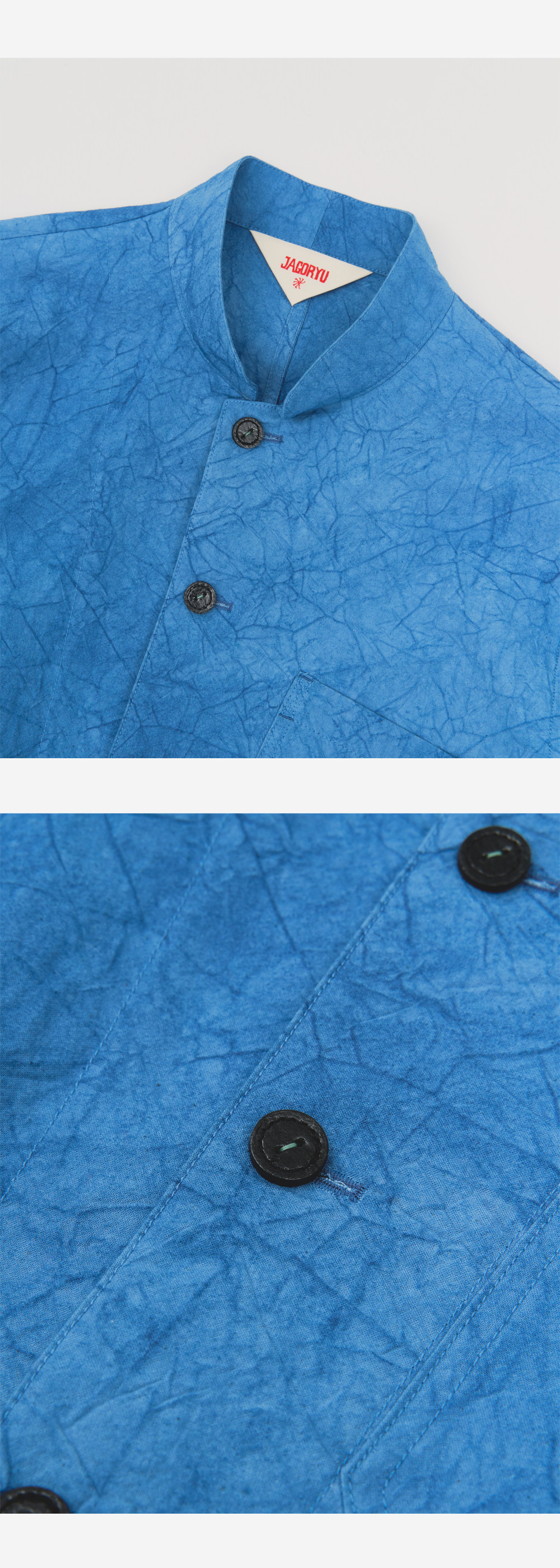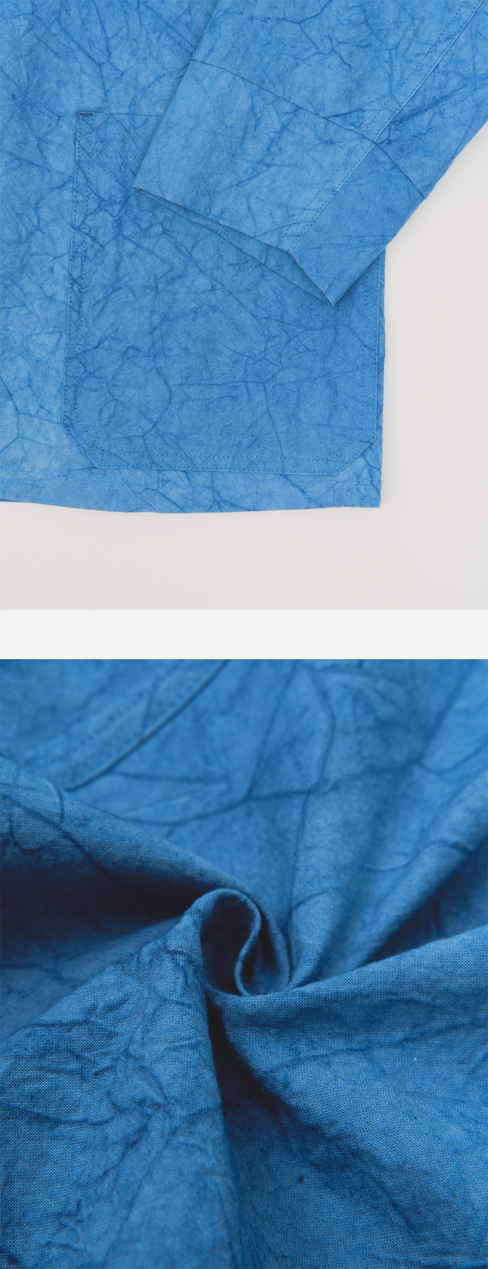 1940년대 후반 또는 1950년대 초반에 만들어진 프랑스 작업복에서 영감을 받았습니다. 가슴 포켓은 사용이 편리하기 위해 주머니 입구가 왼쪽 어깨를 향해있습니다. 쪽 염색으로 푸른 빛을 만들었습니다. 장인이 공들여 만든 통가죽 단추를 전면에 달고, 의도적으로 구겨진 질감으로 새롭게 해석되었습니다.