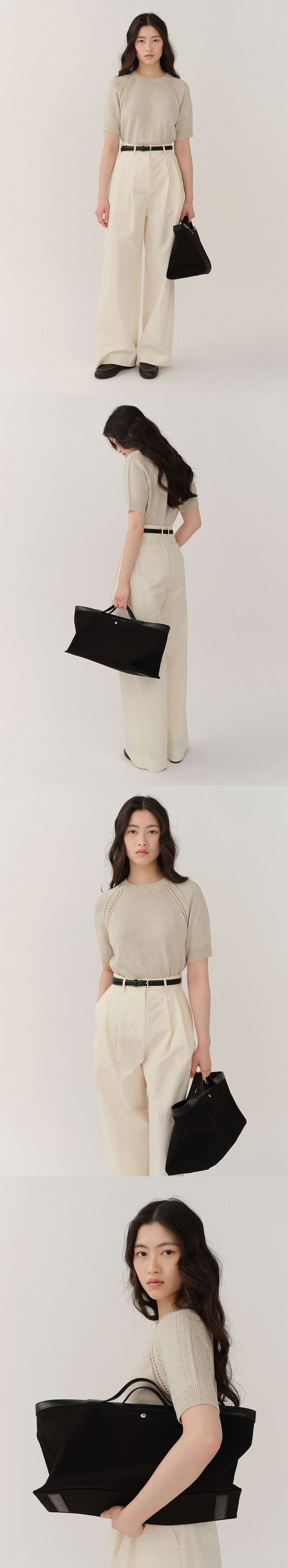 탄탄한 코튼 원단과 은은한 광택의 소가죽 트리밍. 토트로 착용 가능한 간결한 핸들 디테일. 넉넉한 내부 수납과 2개의 오픈 포켓 구성. 오픈 클로징이 가능한 견고한 링 장식.