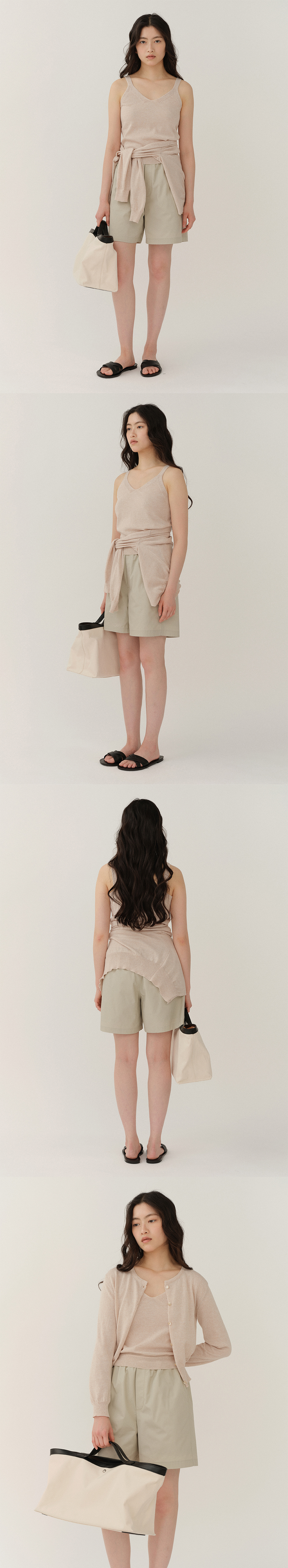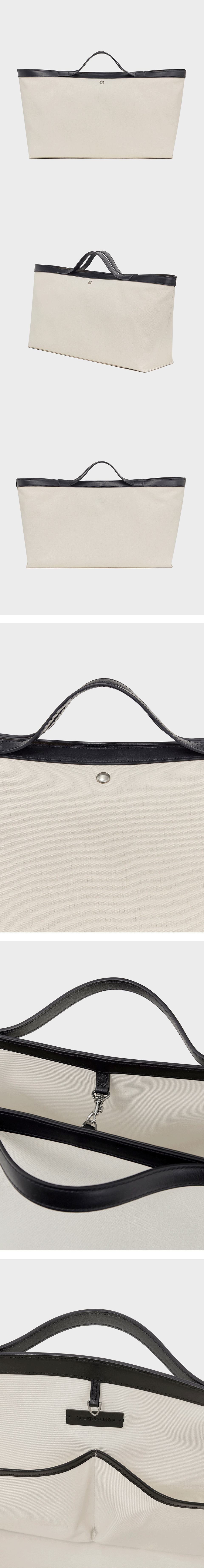 탄탄한 코튼 원단과 이태리 소가죽 트리밍. 토트로 착용 가능한 간결한 핸들 디테일. 넉넉한 내부 수납과 2개의 오픈 포켓 구성. 오픈 클로징이 가능한 견고한 링 장식.