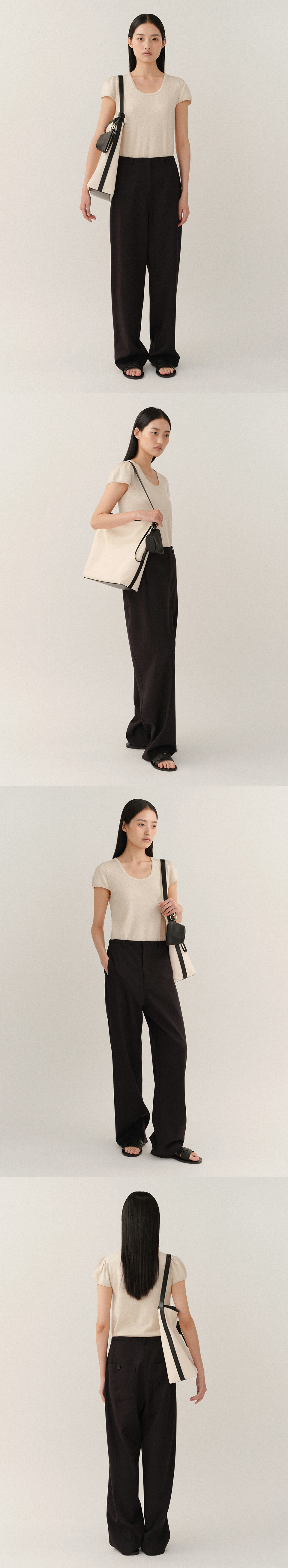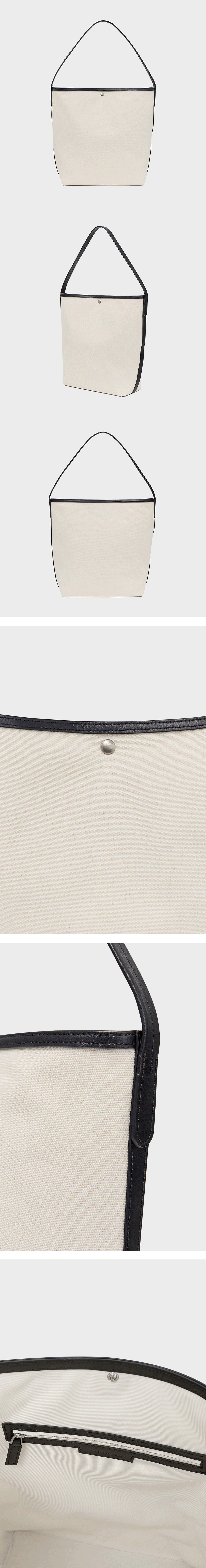 탄탄한 코튼 원단과 이태리 소가죽 트리밍. 오픈 클로징이 가능한 스냅 장식. 넉넉한 내부 수납과 1개의 지퍼 포켓. 숄더백으로 캐주얼하게 착용 가능한 디자인.