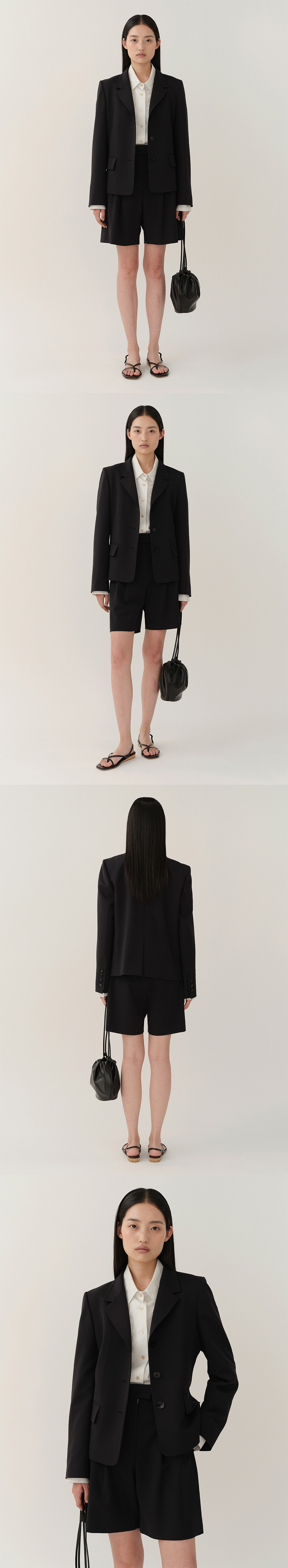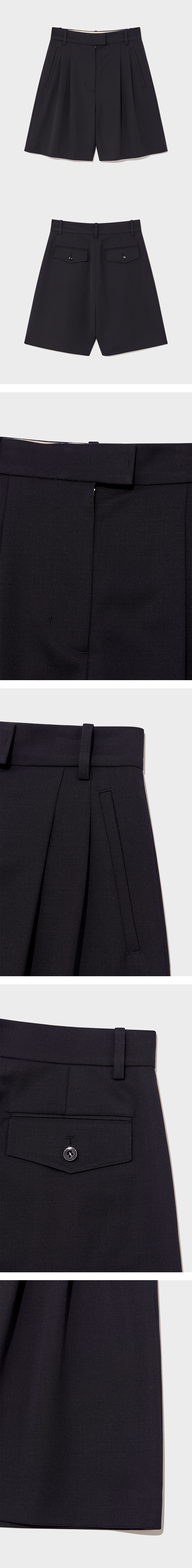 울 혼방 세미 에이라인 하프 팬츠. 두 개의 턱 디테일, 여유로운 핏, 앞면으로 위치한 사선 포켓, 차분하고 유연한 울 혼방 소재, 허리밴드 안단에 제작 고시우라 내장, 앞 중심 오픈 지퍼로 여밈.