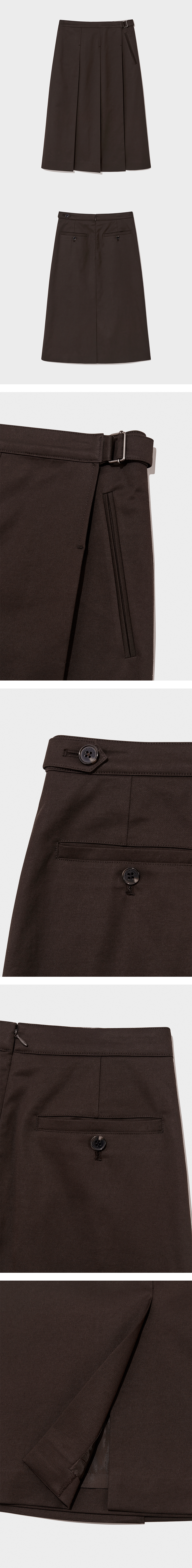플리츠 랩 미디 스커트. 차분한 세미 에이라인 실루엣, 앞면 플리츠단이 랩으로 연결되는 디테일, 허리밴드 안단에 제작 고시우라 내장, 후면 중심 숨김 지퍼 여밈.
