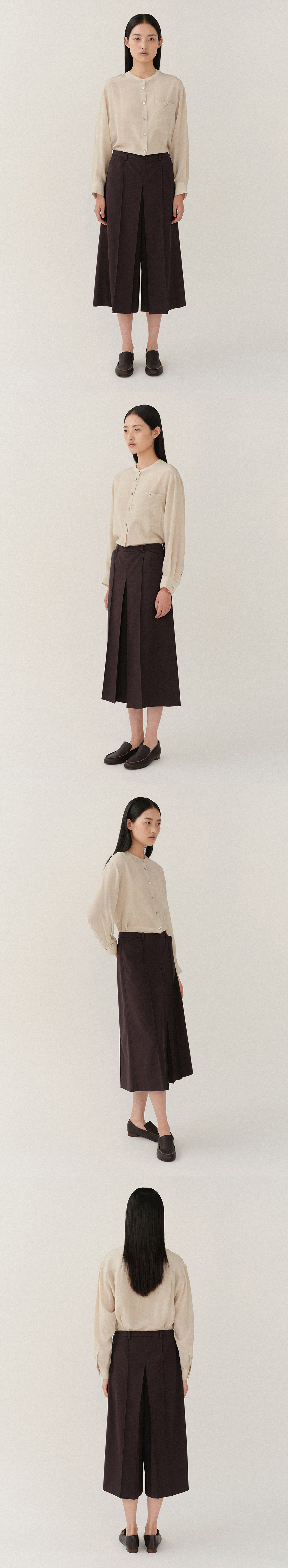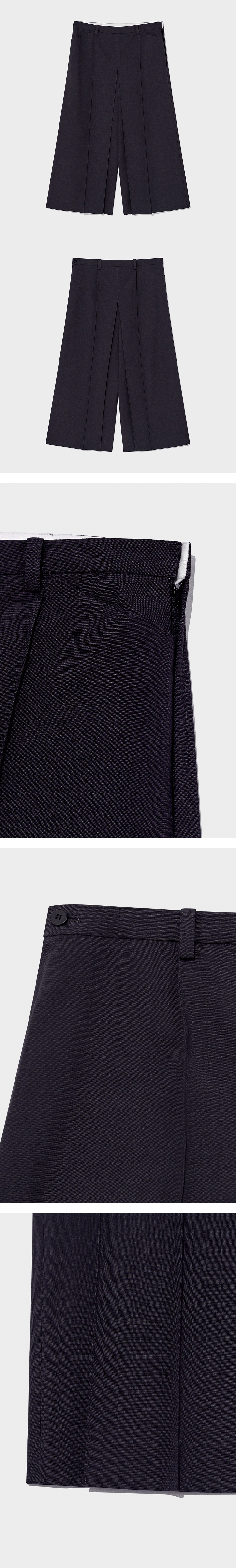 플리츠 미디 에이라인 크롭 팬츠. 앞면의 프레스드 크리즈, 앞중심 턱 디테일, 가벼운 소재, 무릎 아래 미디 기장, 사이드 히든지퍼 오픈 여밈.