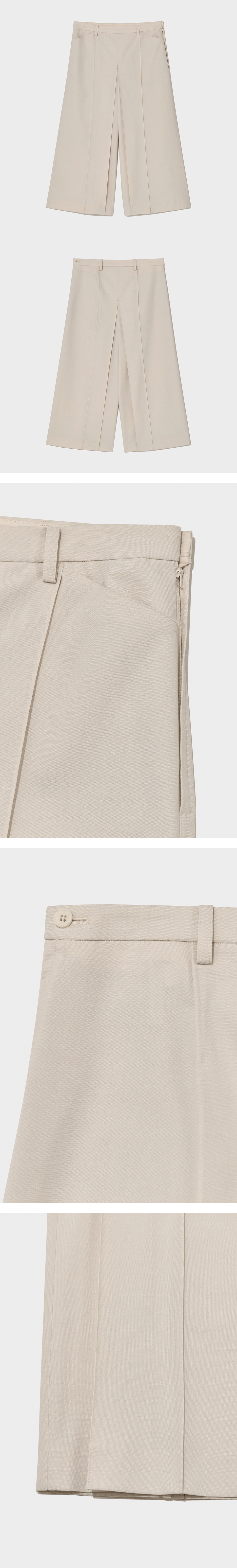 플리츠 미디 에이라인 크롭 팬츠. 앞면의 프레스드 크리즈, 앞중심 턱 디테일, 가벼운 소재, 무릎 아래 미디 기장, 사이드 히든지퍼 오픈 여밈.