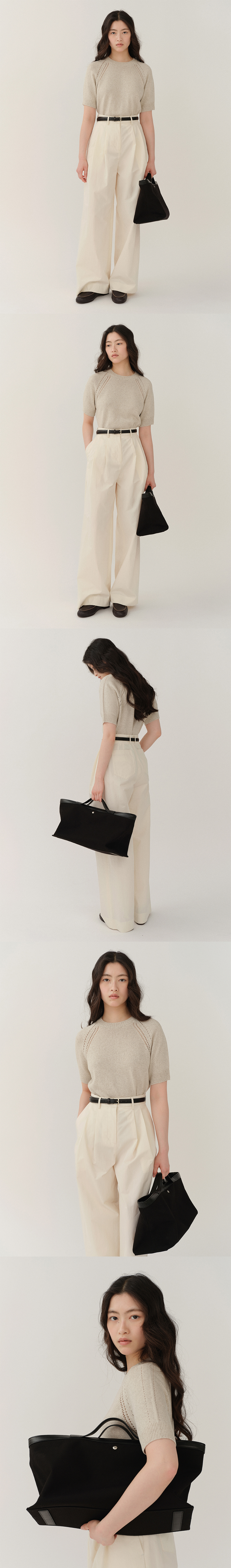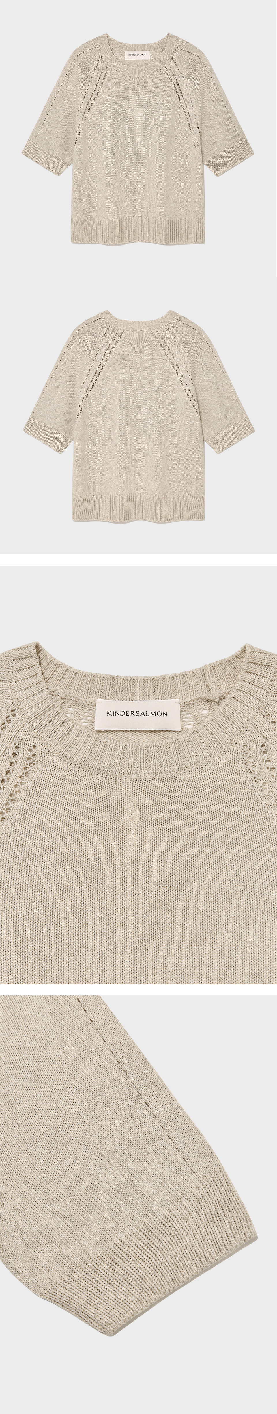 라글란 하프 슬리브 니트. 소매에 홀 조직을 인서트한 디테일, FLAX(아마) 원사 혼방으로 시원한 터치감과 라이트한 중량감.