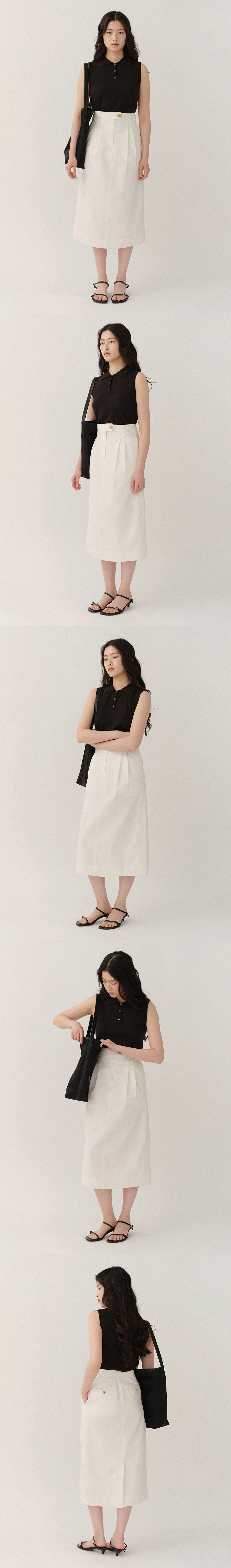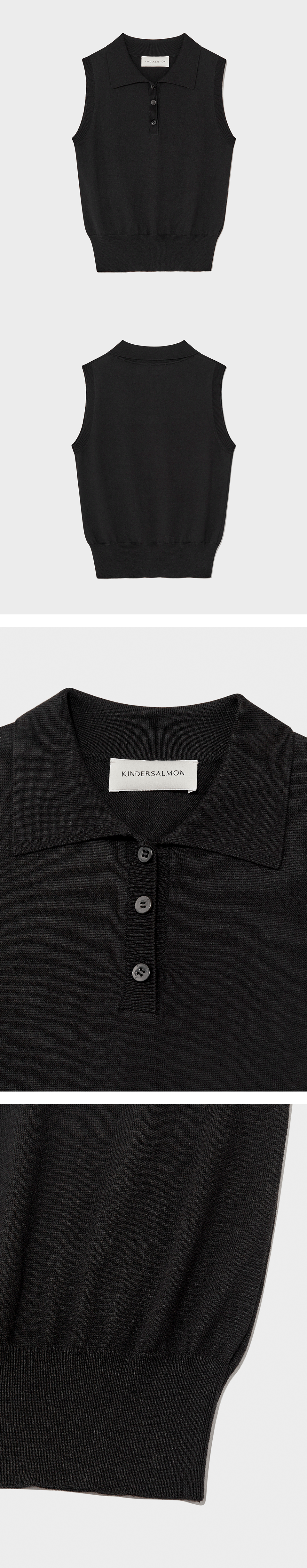 에센셜 버튼 업 카라 니트 슬리브리스. 슬림핏, 3-버튼 오픈, 투명한 빛을 띄는 디테일의 버튼. 부드러운 터치감의 모달 원사 혼방.