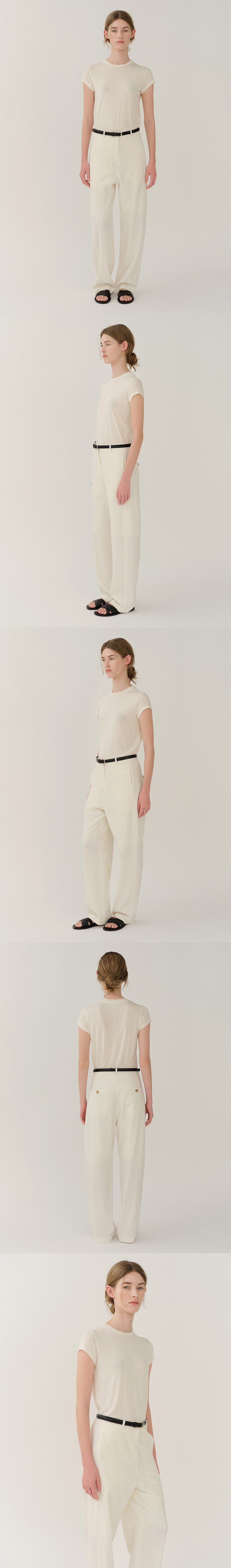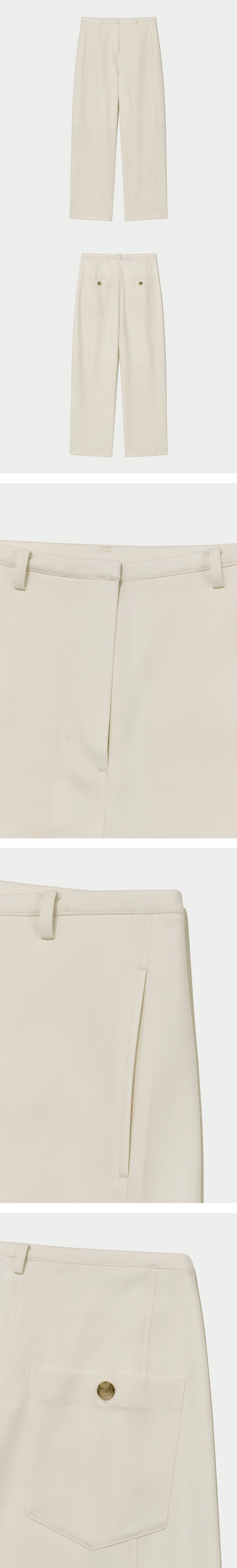 차분한 배럴 핏의 로우 라이즈 테일러드 팬츠. 울 혼방 소재, 슬림한 허리밴드, 앞면 절개 라인에 히든 사이드 포켓, 앞중심 오픈지퍼 여밈, 후면 아웃포켓과 로고 각인 디테일의 버튼. 안감으로 비침 최소화.