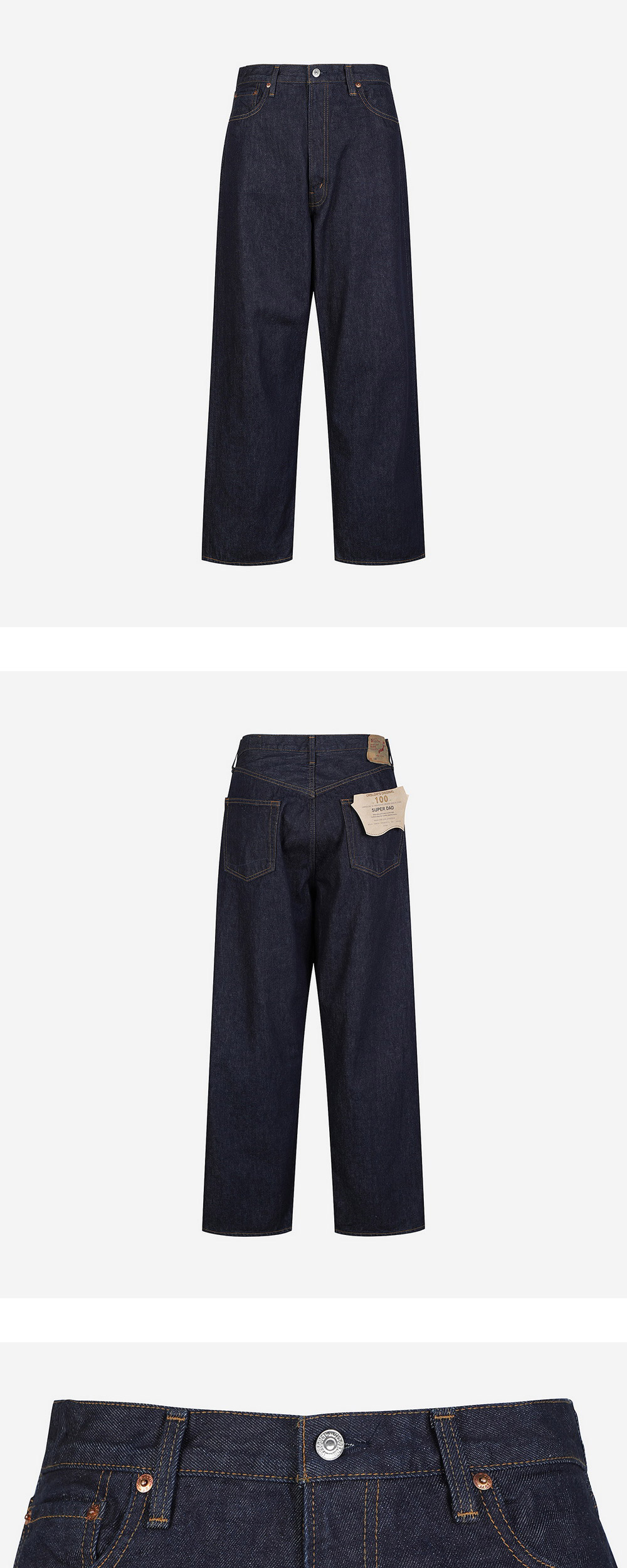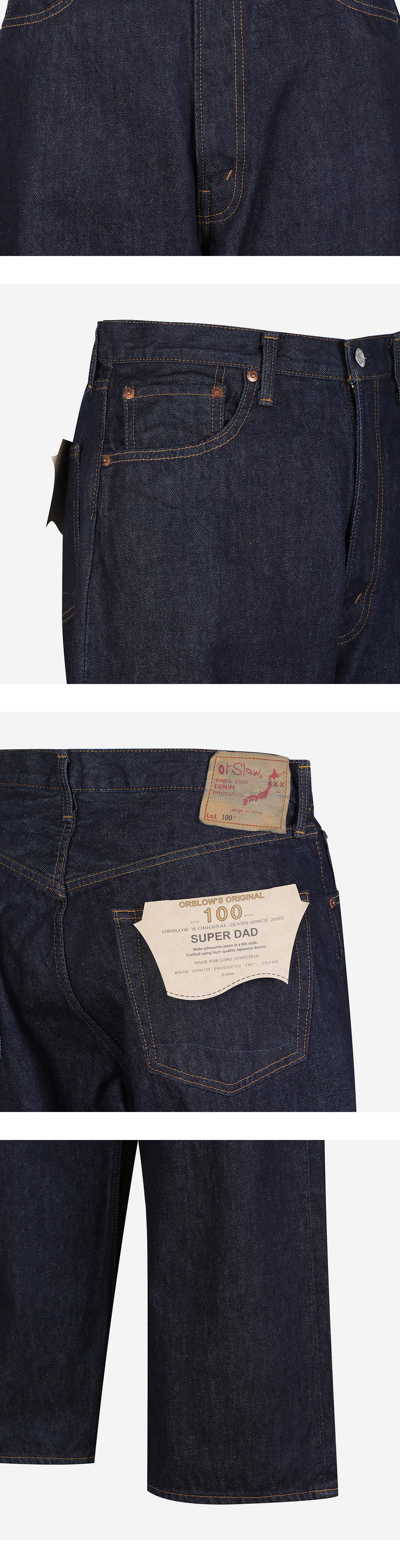 빈티지한 패치 디테일이 특징인 오어슬로우의 슈퍼 대즈 데님 팬츠입니다. - 스트레이트 핏 - 후면의 로고 패치 디테일