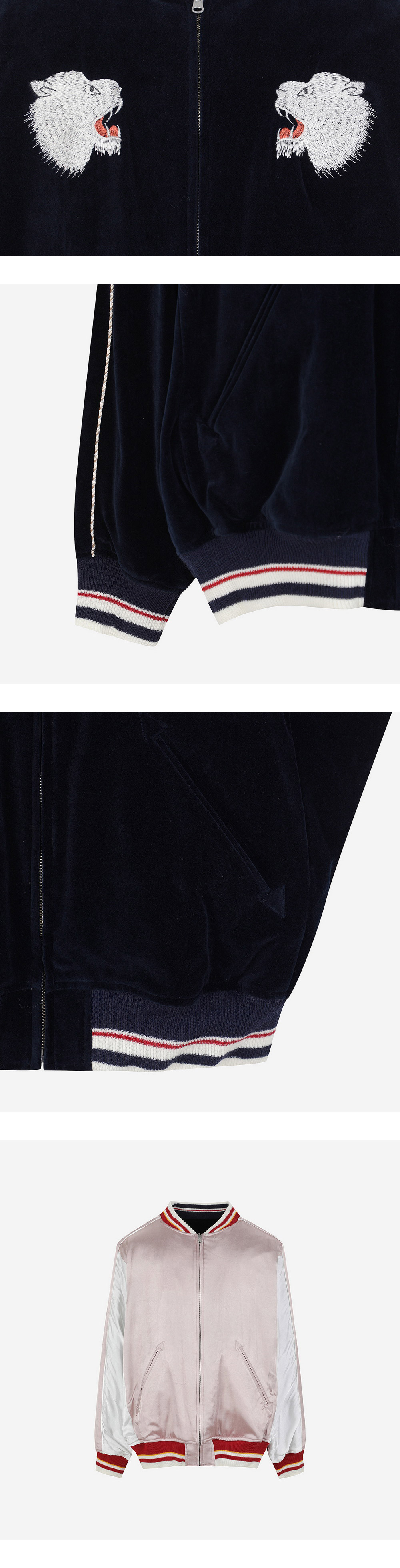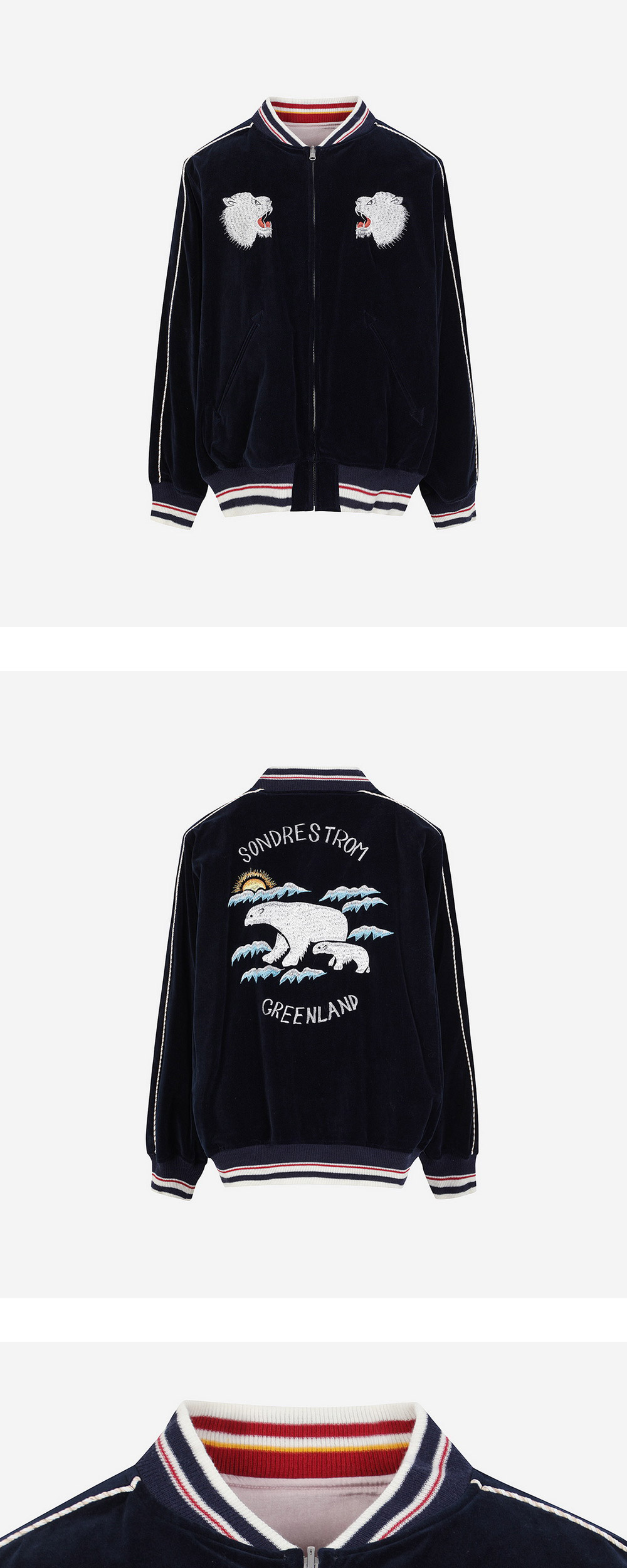다이리쿠만의 자수 아트워크가 돋보이는 폴라 베어 벨루어 스카 점퍼입니다. - 전면과 후면의 자수 디테일 - 리버시블 디자인