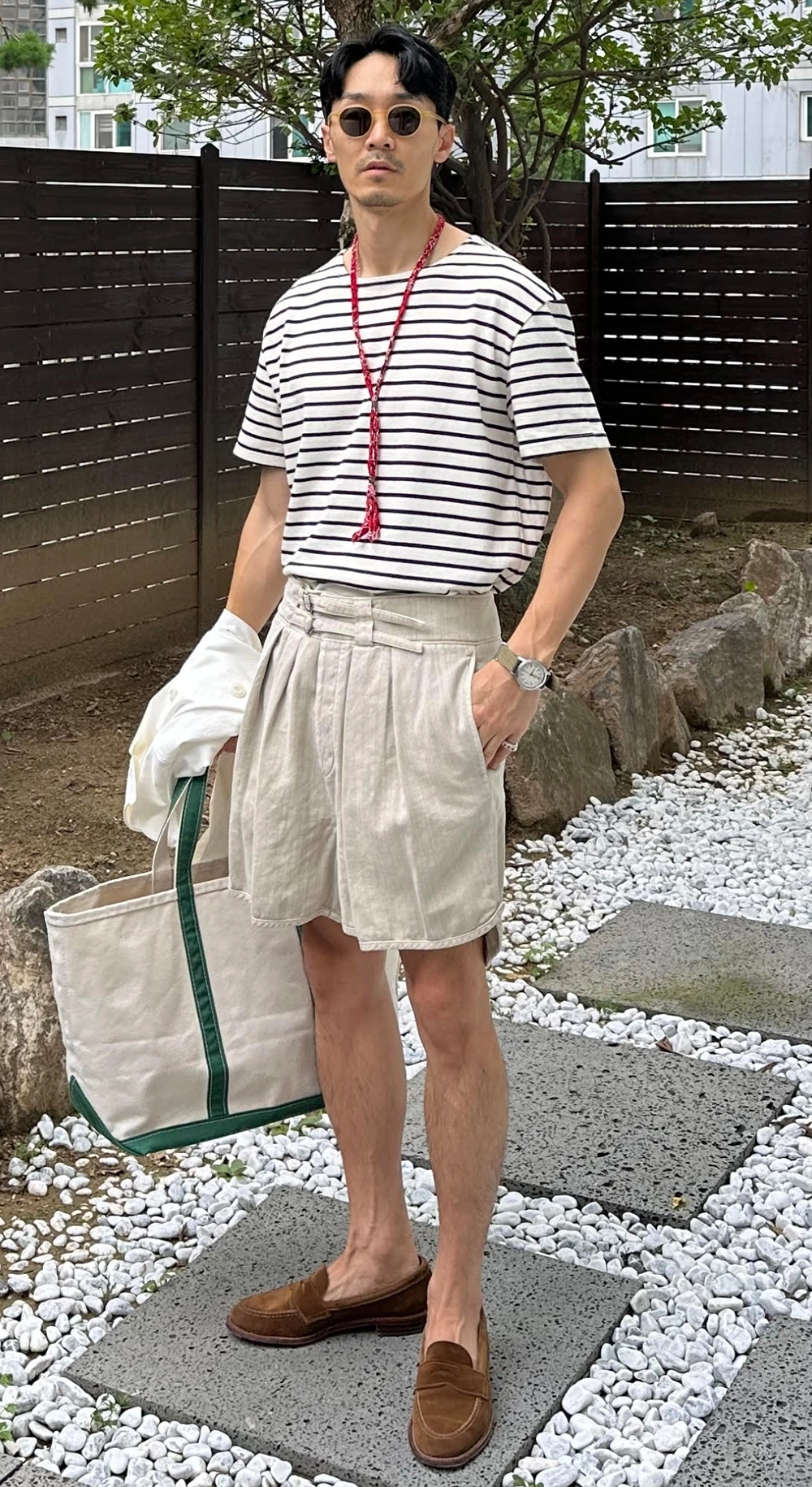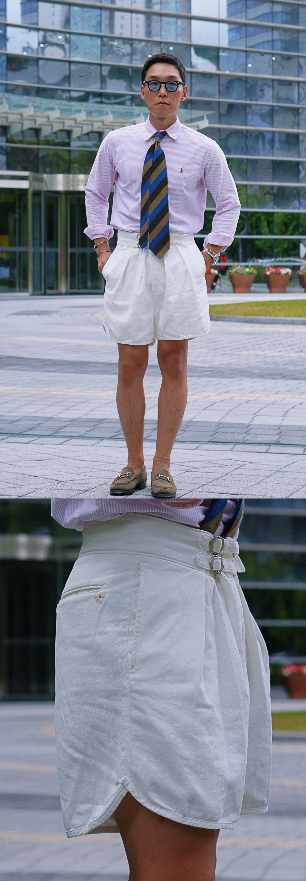 [제품소개] 제품명 : Gurkha Shorts 색 상 : Off white / Washed Beige / Washed Black 구르카용병(영국에서 고용한 네팔 용병)이 입었던 열대 고온용 반바지에 디자인 기반을 둔 구르카팬츠는 열대환경에서 착장하기 접합하도록 앞 주름을 넉넉히 주어 허리, 엉덩이, 허벅지가 여유로워 고온다습한 환경에서 착용하기 편합니다. 20수 코튼 트윌을 후염하여 오리지널 구르카 팬츠의 디자인과 디테일을 살렸지만 밑단을 둥글게 굴리는 돌핀 팬츠의 디자인 디테일을 믹스하여 재해석. 두개의 허리벨트로 사이즈 조절이 가능해 오버사이즈, 정사이즈 두가지 다 즐겨보세요. 소 재 : 100% Cotton