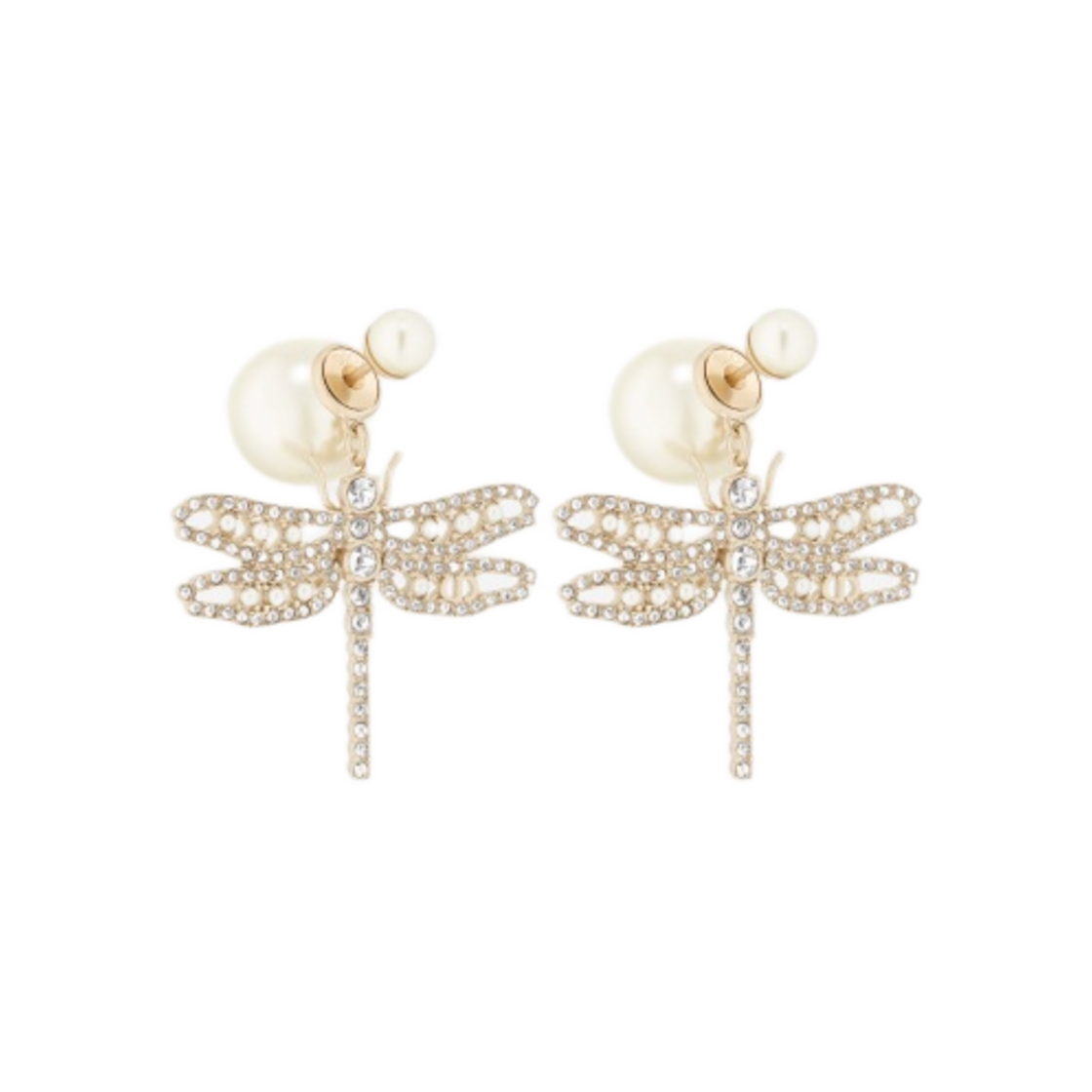 (W) Dior Tribales Earrings Matte Gold-Finish Metal with White Resin Pearls and Silver-Tone Crystals