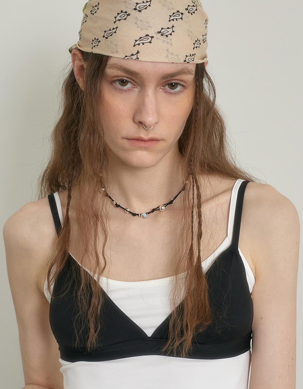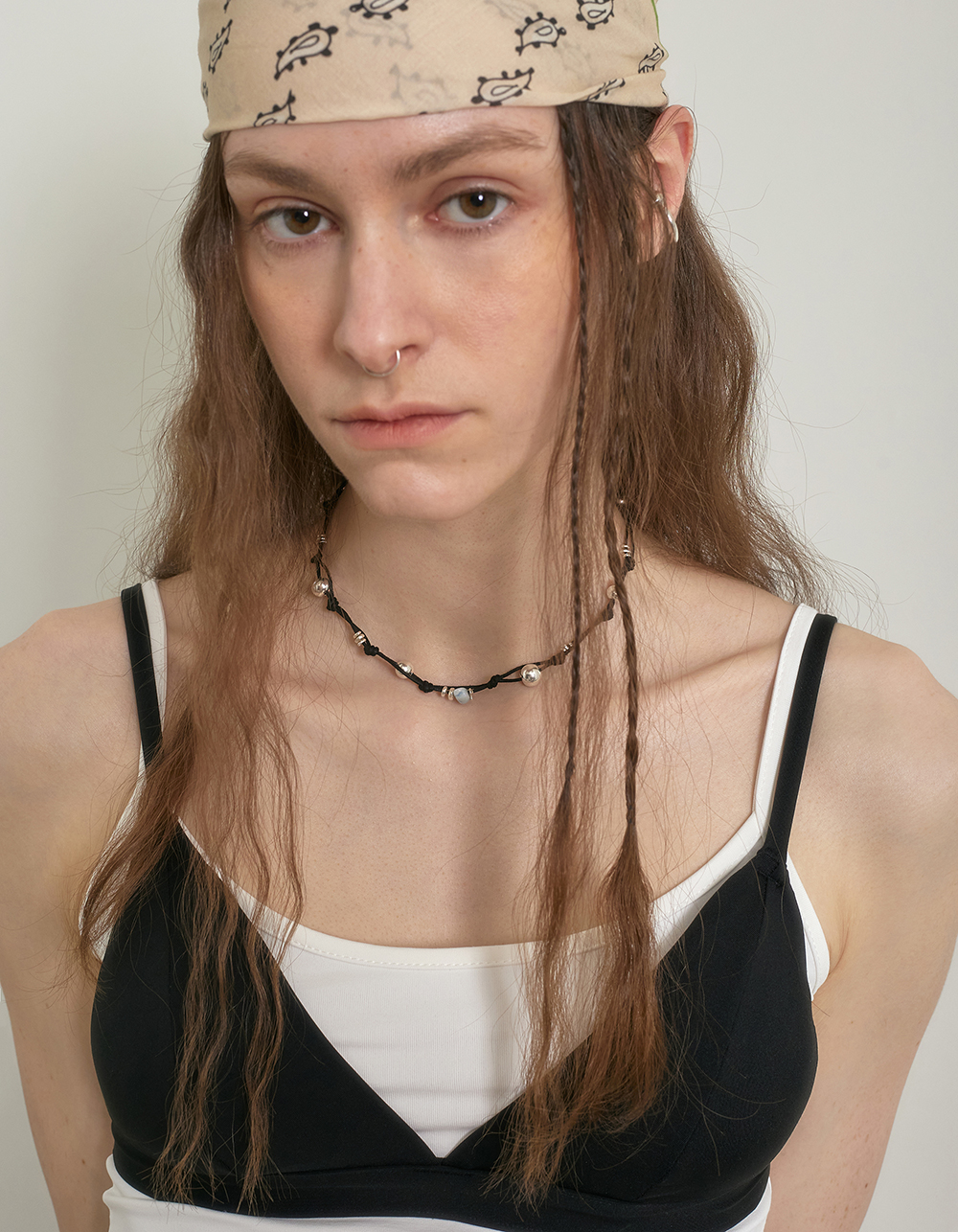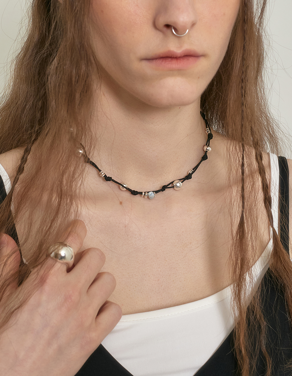 매트한 코튼 끈에 크기가 다른 실버볼, 원석, 카렌 실버가 베레이션된 네클리스입니다.