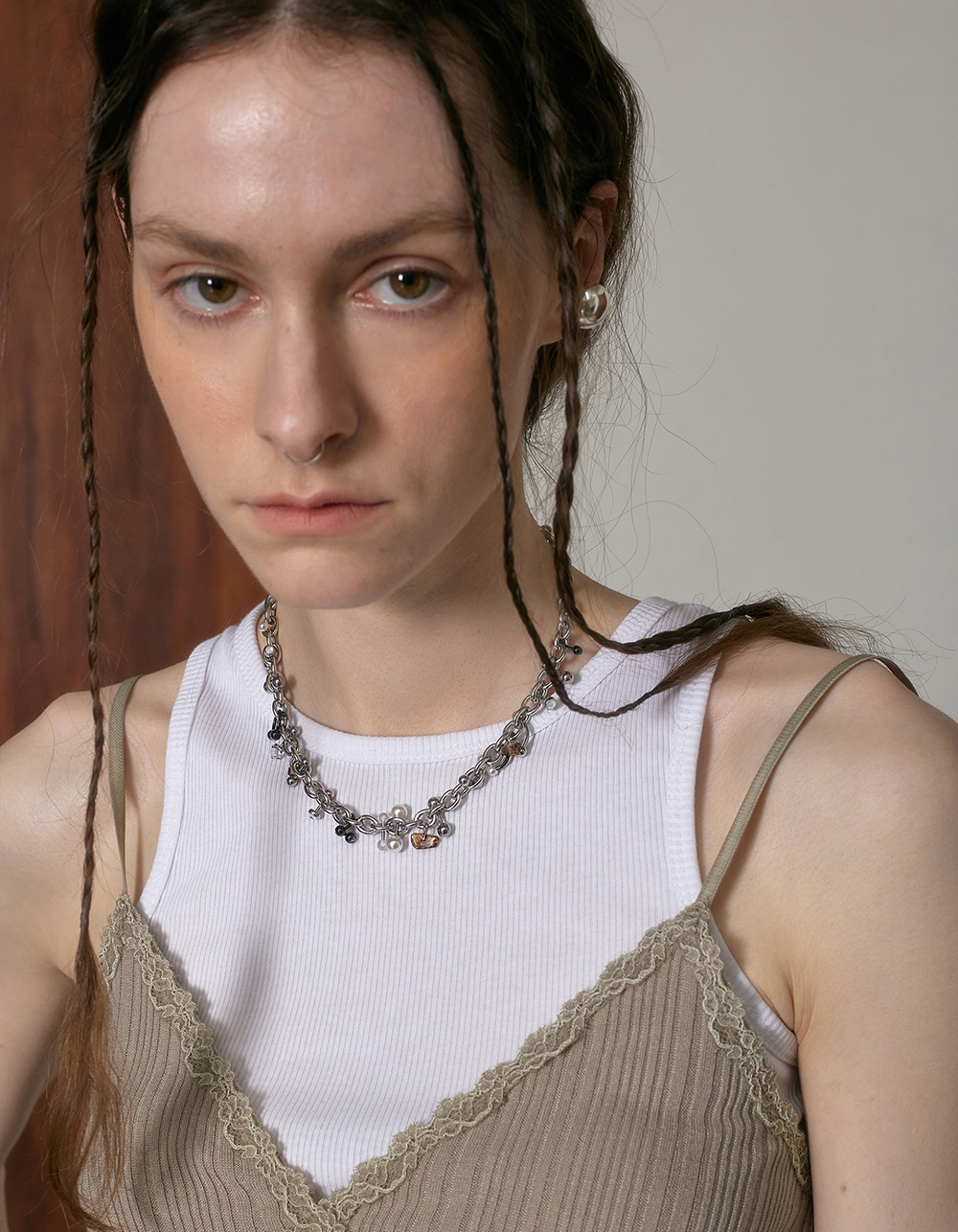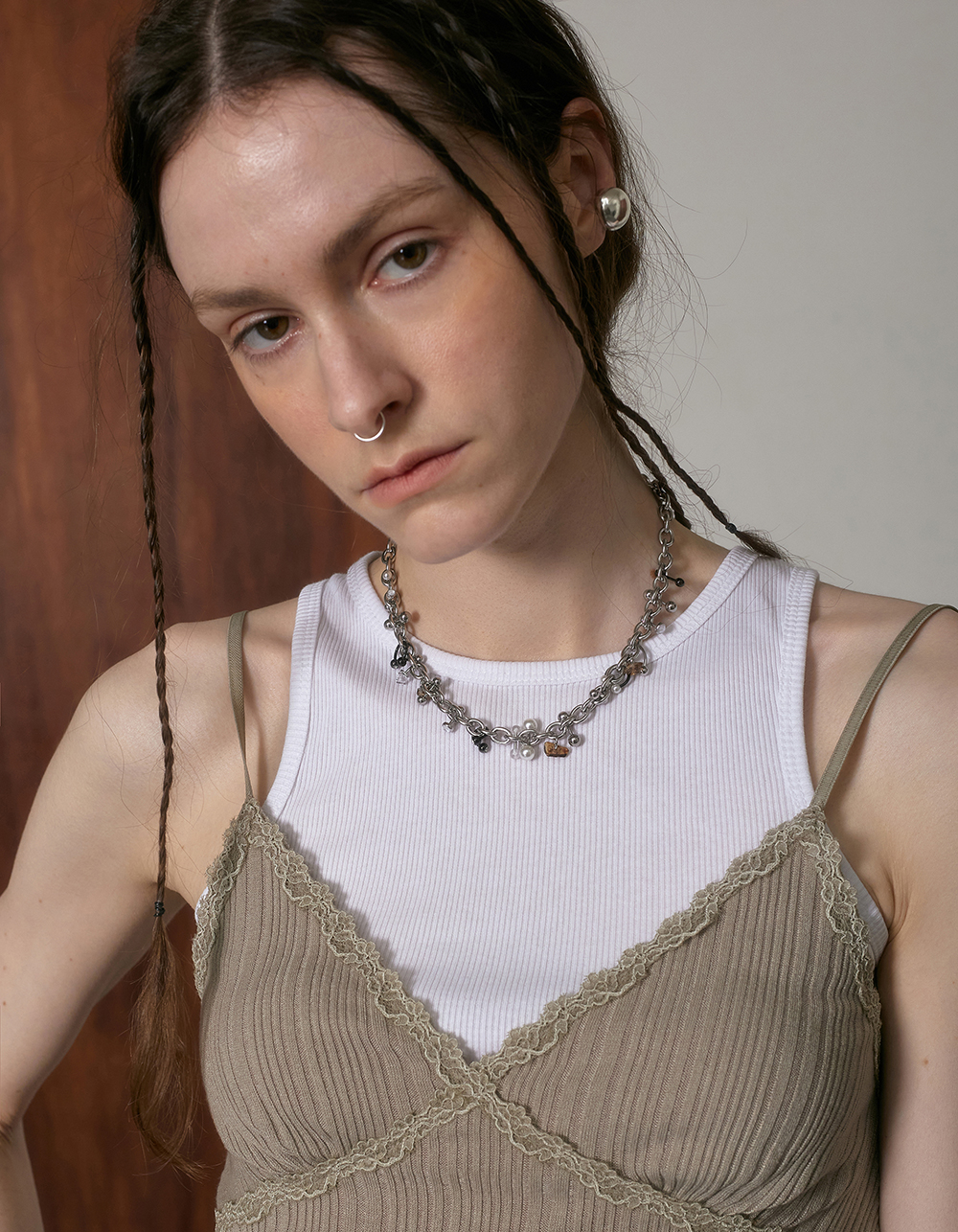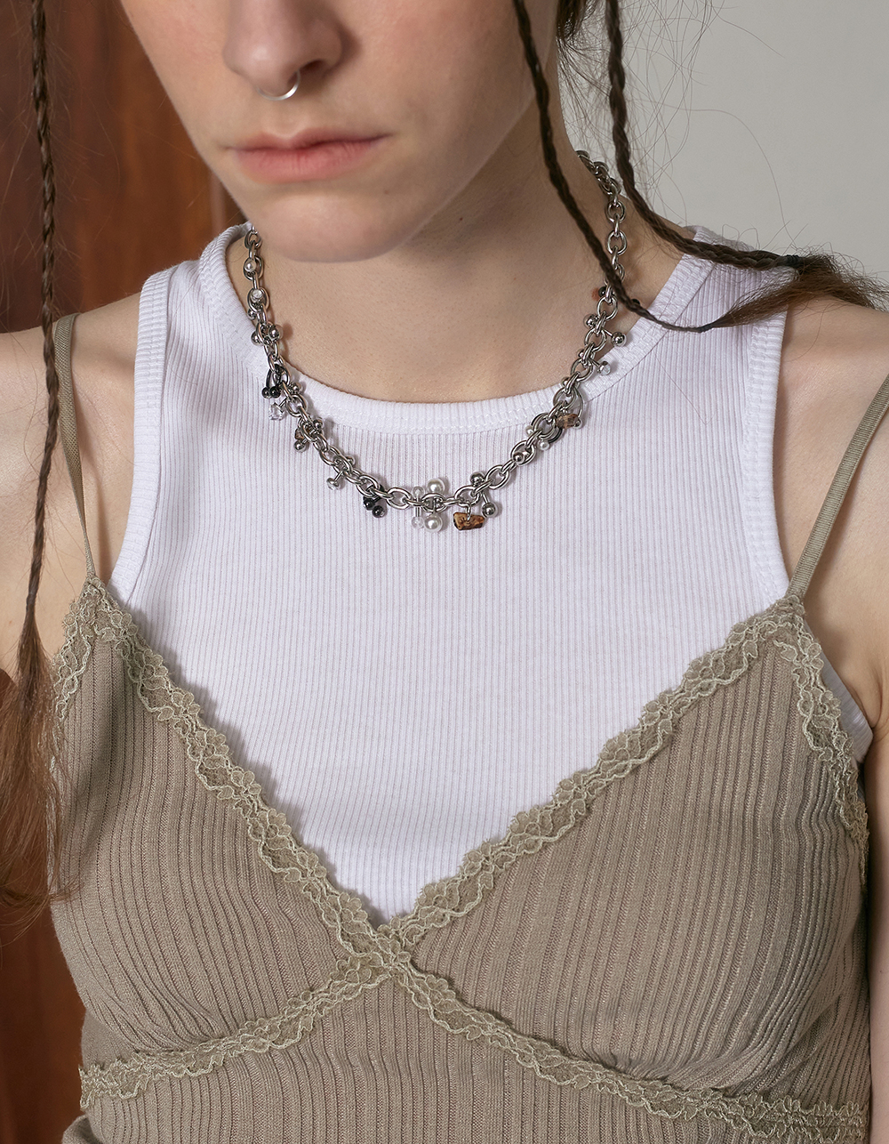 브라운 톤의 글라스 칩과 여러가지 종류의 피어싱이 베레이션된 브레이슬입니다.