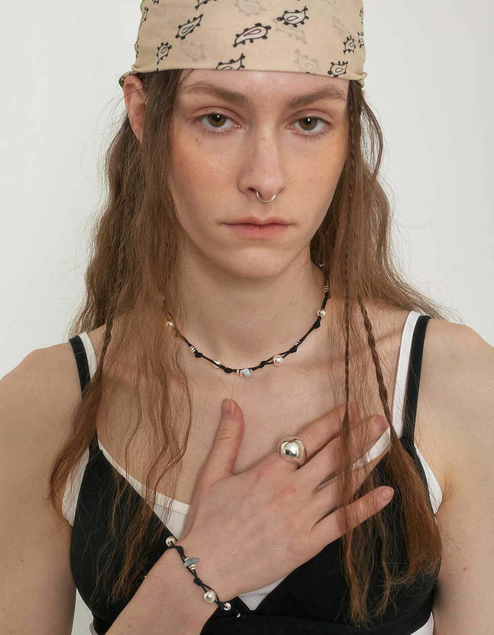 매트한 코튼 끈에 크기가 다른 실버볼, 원석, 카렌 실버가 베레이션 된 브레이슬릿입니다.
