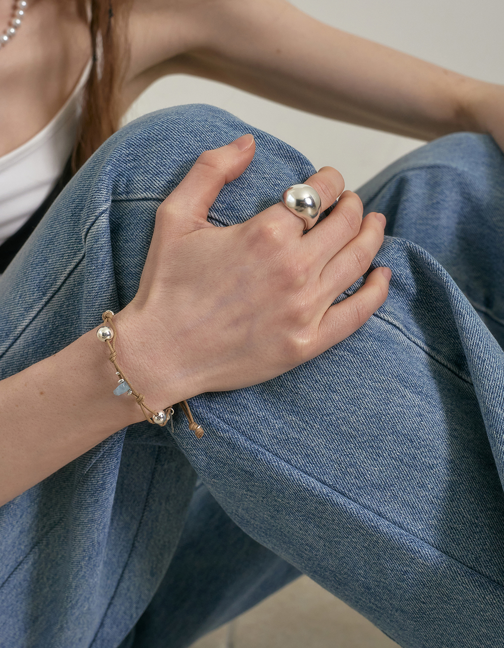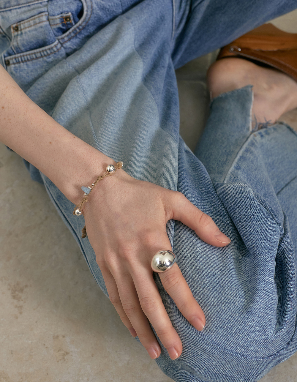 매트한 코튼 끈에 크기가 다른 실버볼, 원석, 카렌 실버가 베레이션 된 브레이슬릿입니다.