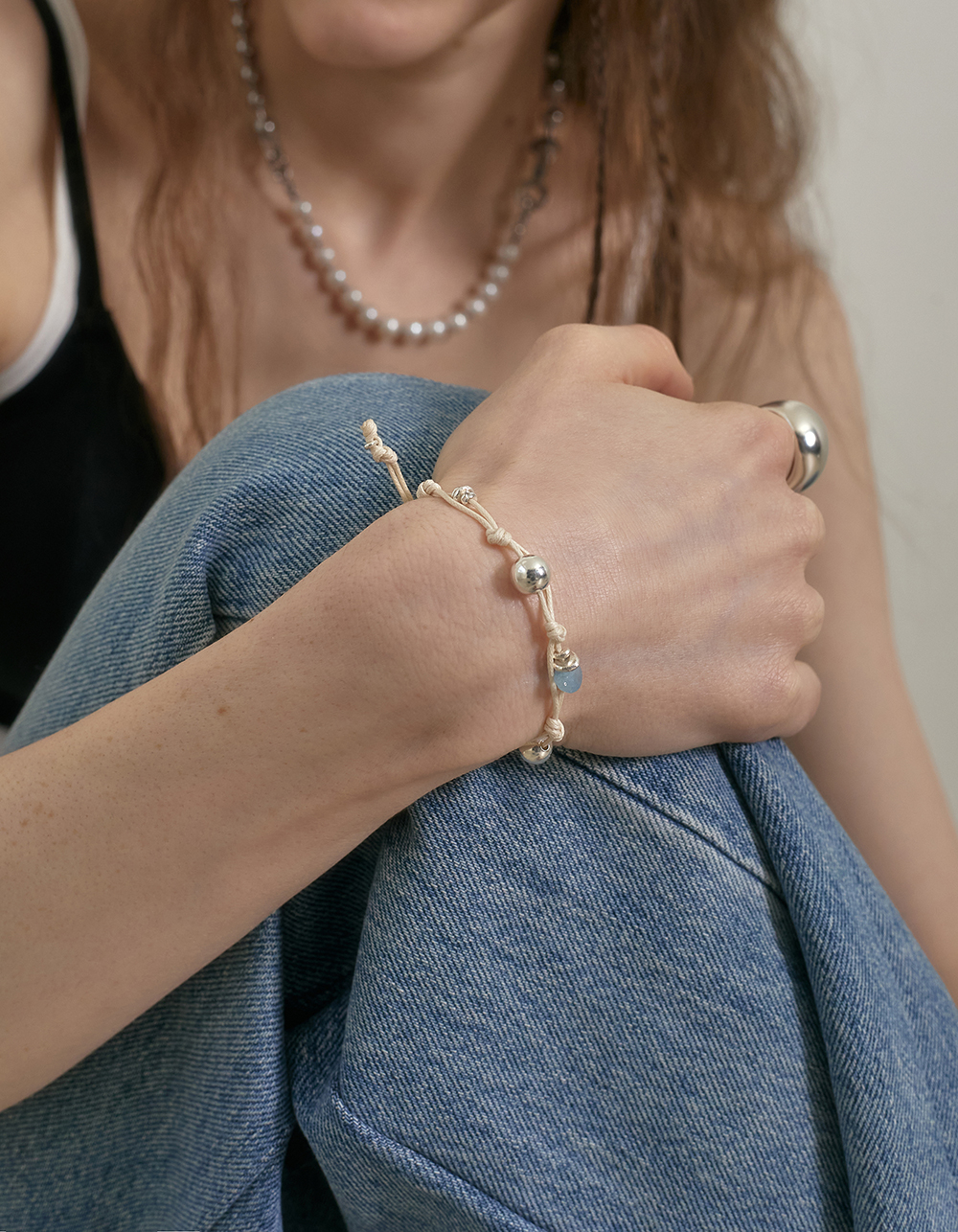 매트한 코튼 끈에 크기가 다른 실버볼, 원석, 카렌 실버가 베레이션 된 브레이슬릿입니다.