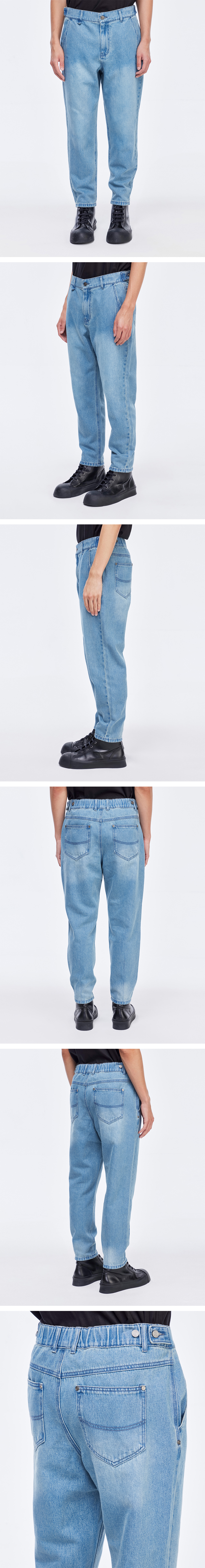 - 슬림한 실루엣의 테이퍼드 데님 팬츠 - 허리 밴딩 및 비조를 통한 사이즈 조절 기능 - 전면 및 밑단 다트를 활용한 디자인 포인트 - 후면에 위치한 아웃포켓 디자인