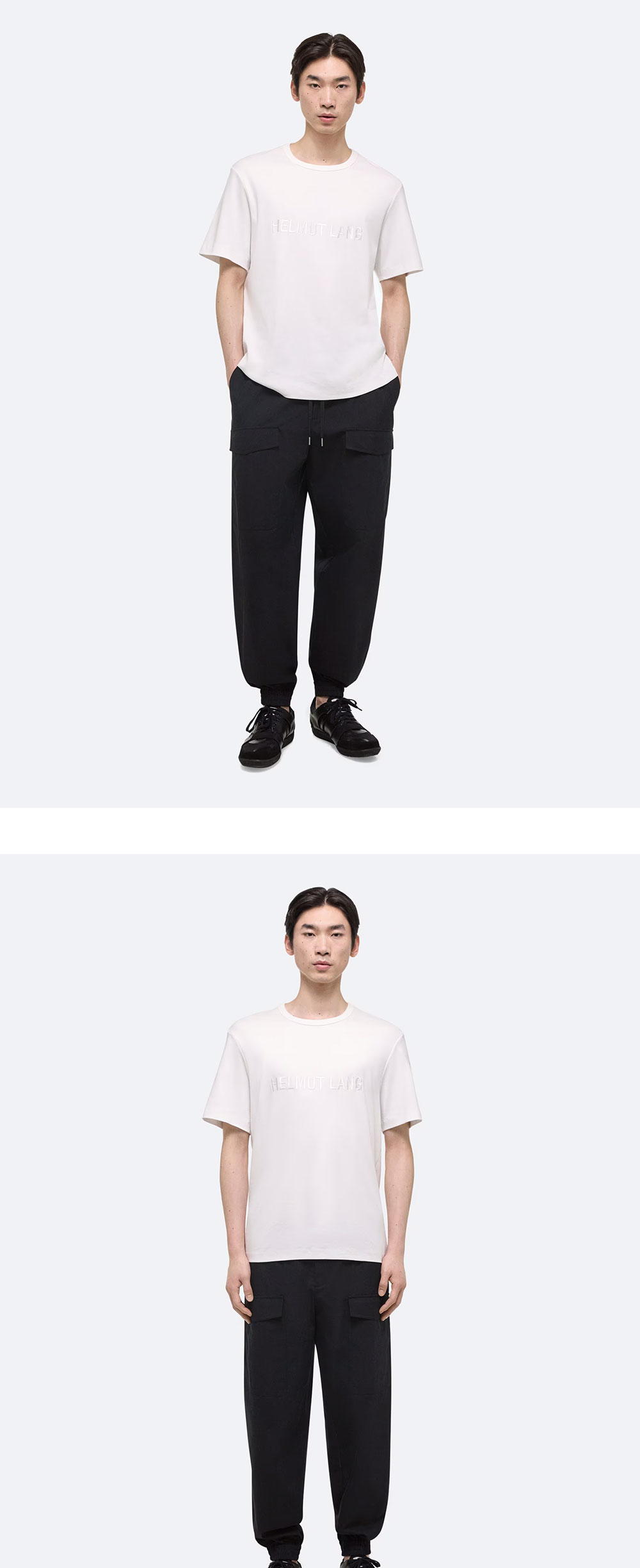 전면의 로고 자수가 특징인 헬무트 랭의 로고 티입니다. - 릴랙스 핏 - 새틴 엠브로이더리 | 사이즈 가이드 | - 모델: 188cm - 착용 사이즈: M