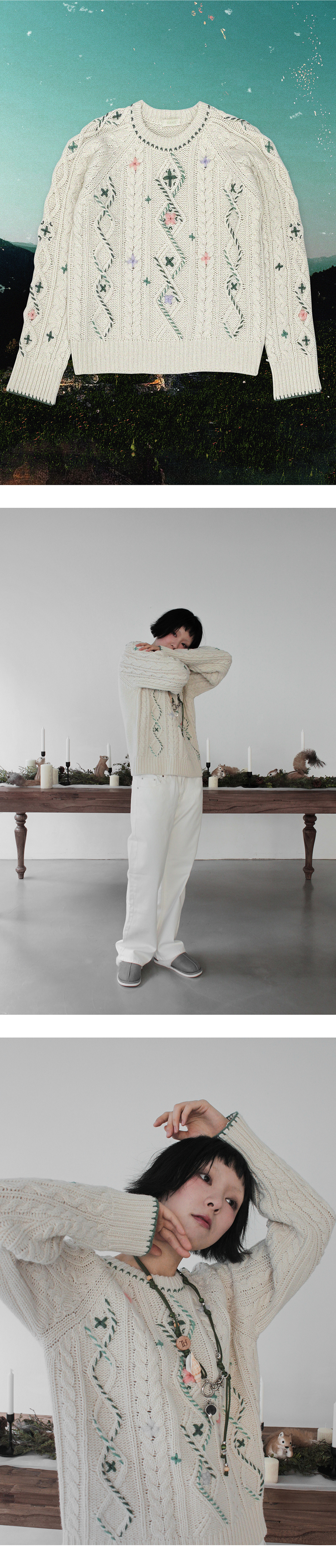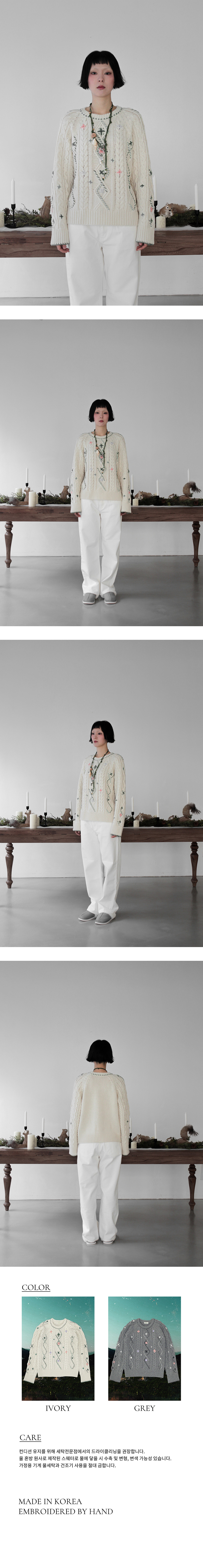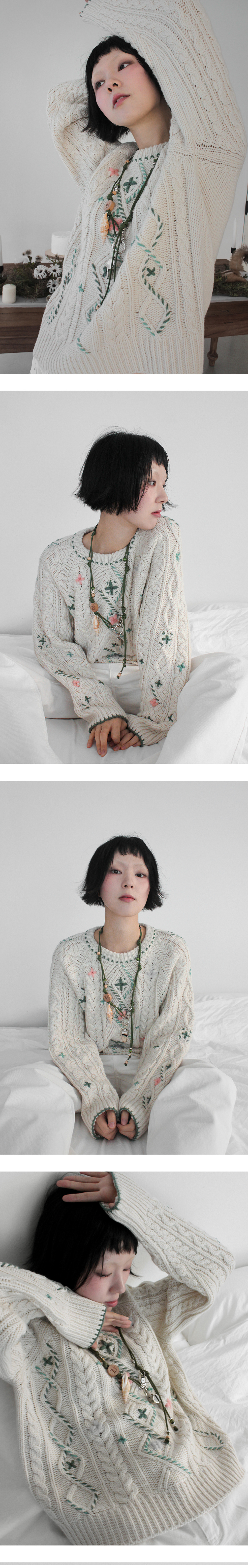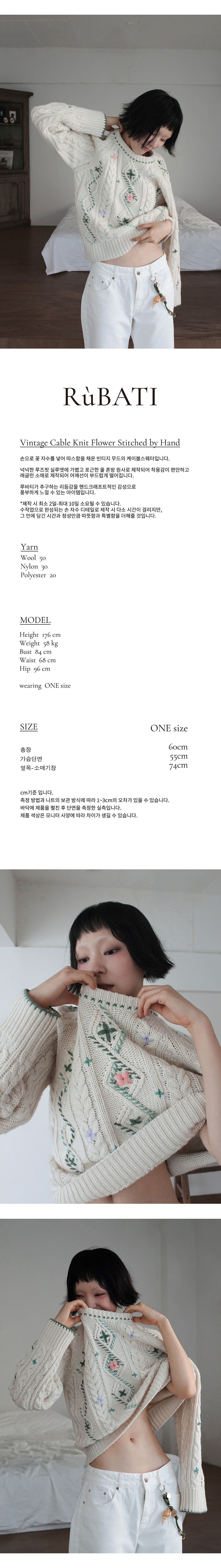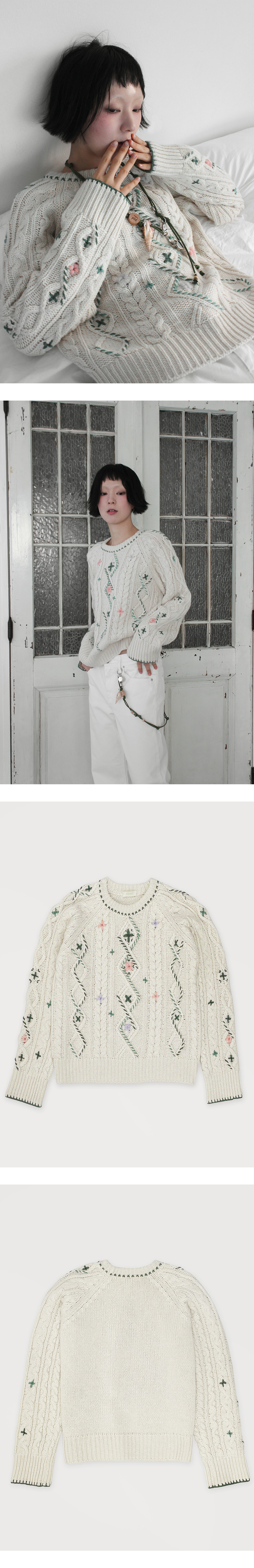 루바티 핸드스티치 빈티지 플라워 케이블 니트 아이보리