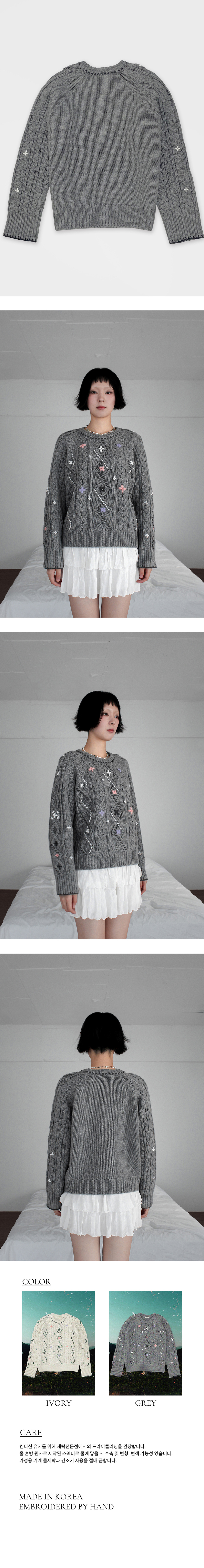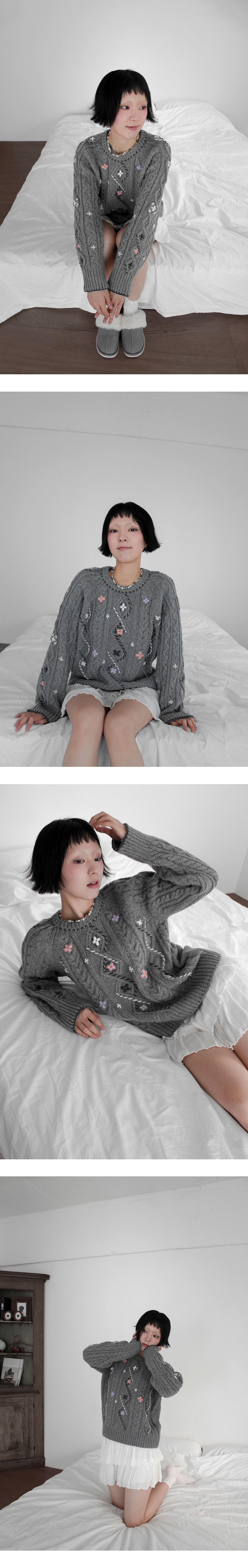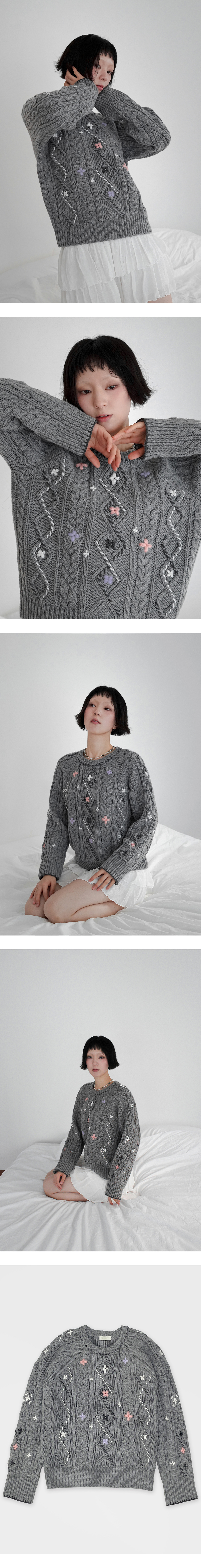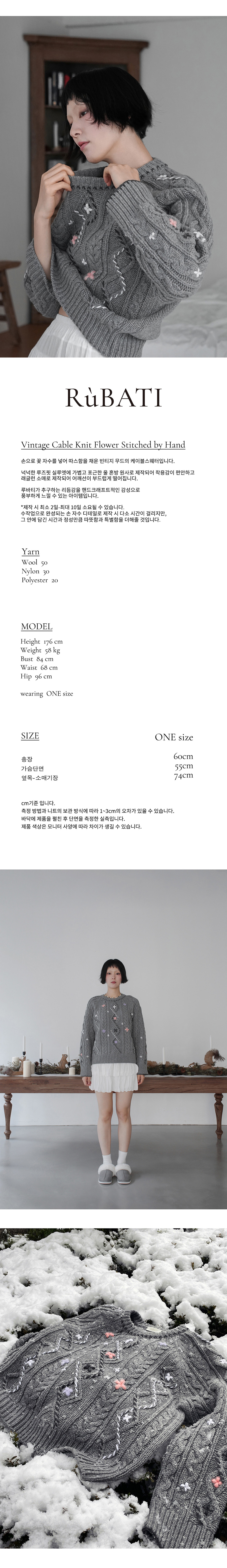 루바티 핸드스티치 빈티지 플라워 케이블 니트 그레이