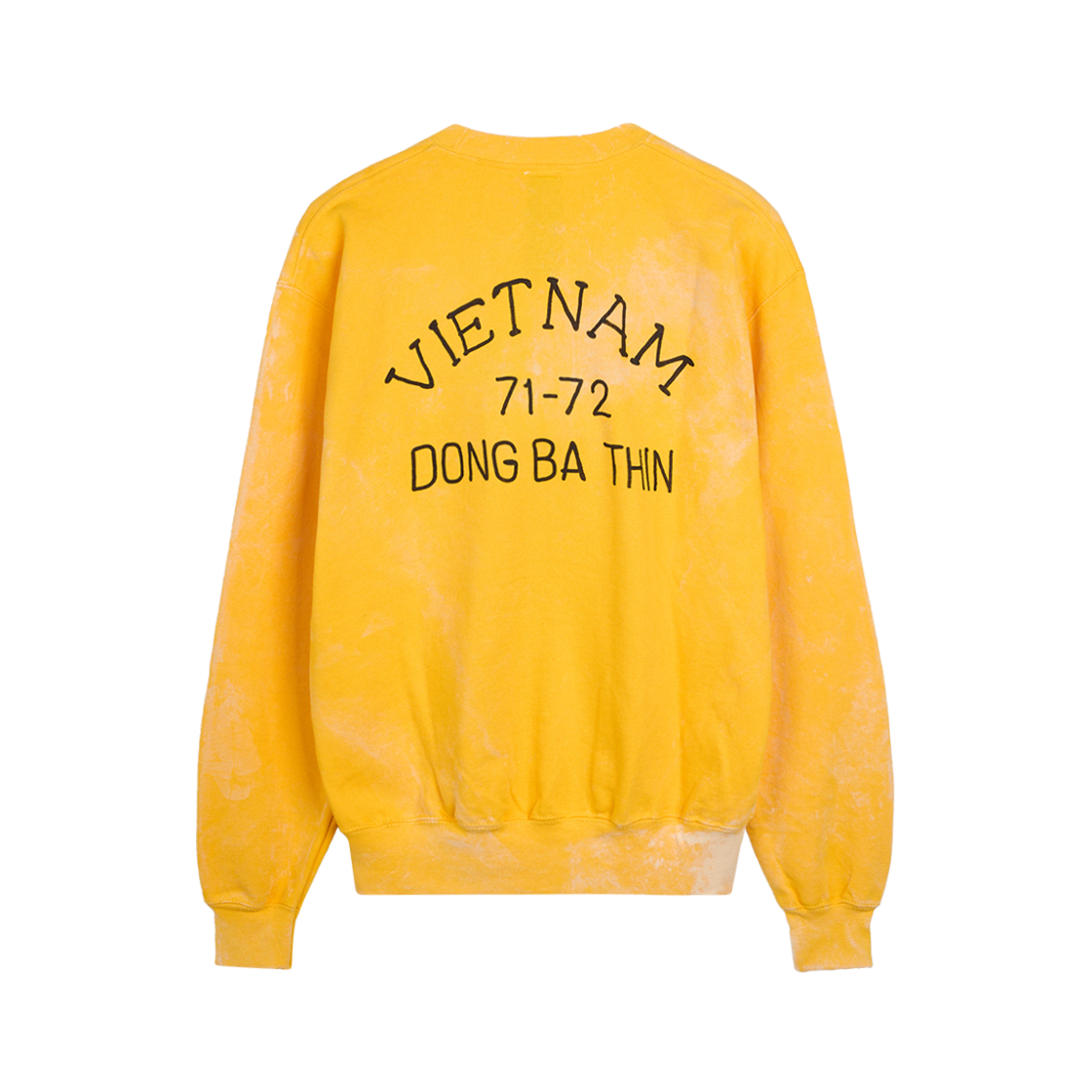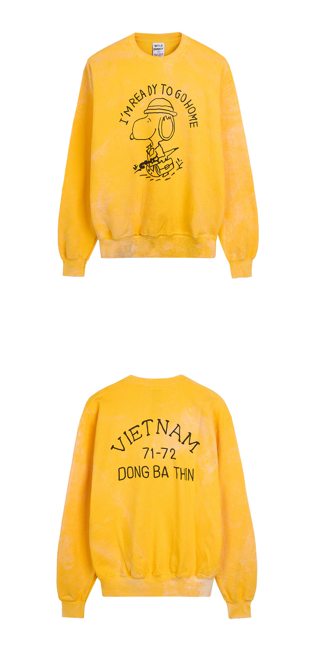 바랜 듯한 컬러와 월남전을 연상시키는 그래픽으로 빈티지한 매력을 지닌 와일드 동키의 스웨트셔츠입니다. - 릴렉스 핏 - 보풀, 데미지, 페인팅 등 빈티지 가공 처리 - 전/후면 월남전을 연상시키는 그래픽 프린팅