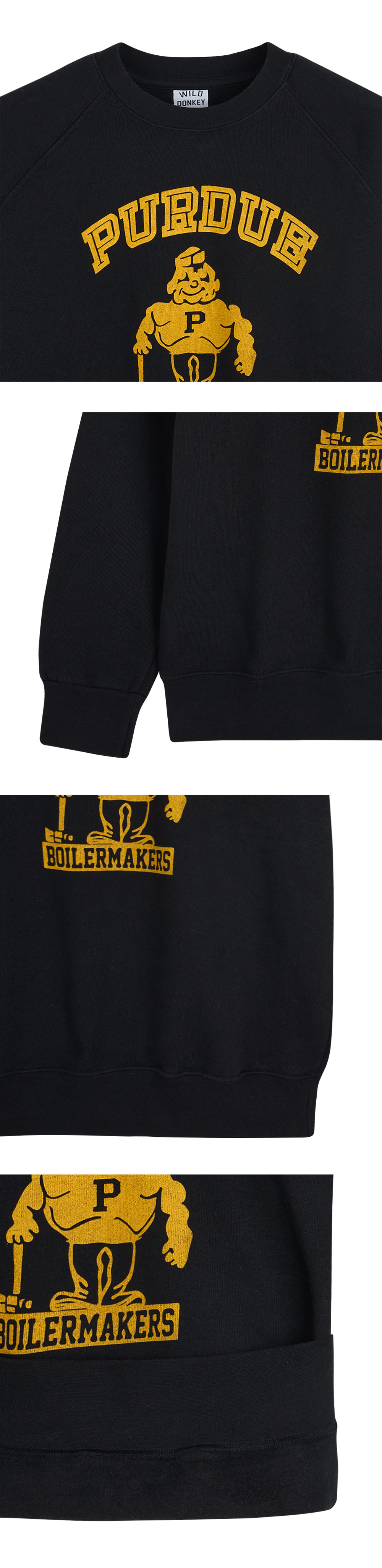 프린팅의 자연스러운 크랙과 래글런 슬리브로 빈티지한 느낌을 주는 와일드 동키의 스웨트셔츠입니다. - 래글런 슬리브 - 전면 빈티지 가공된 퍼듀 보일러메이커스 풋볼팀 로고 프린팅