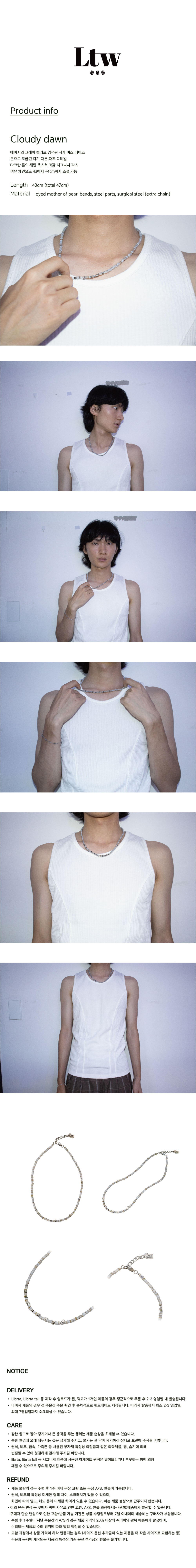 원석, 비즈, 금속, 가죽끈 등 사용된 부자재 특성상 화장품과 같은 화학제품, 땀, 습기에 의해 변질될 수 있어 청결하게 관리해 주시길 바랍니다.