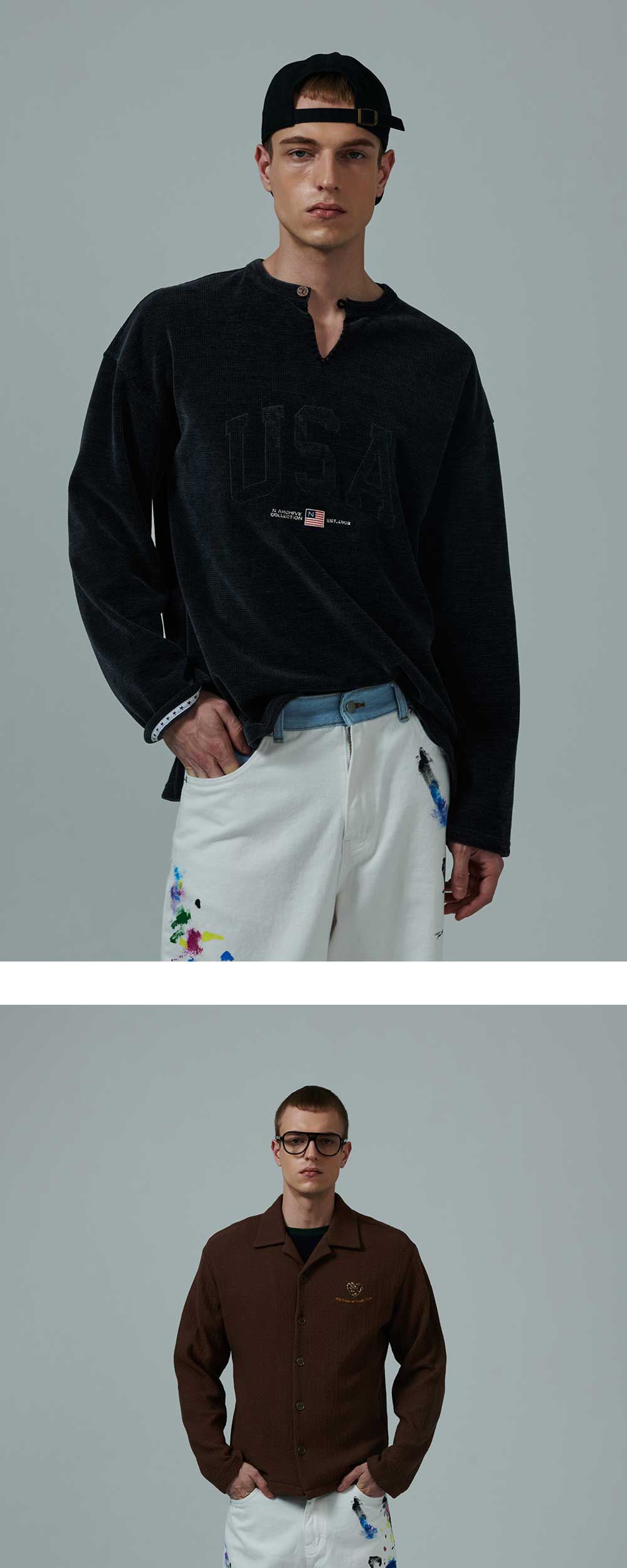 ㆍ아카이브 라인의 핸드 프린팅 데님 ㆍ허리 부분에 배색으로 포인트를 더한 디테일 ㆍ핸드메이드 기법으로 하나하나 직접 터치를 더한 페인트 디테일 ㆍ허리 부분에 사이즈를 조절할 수 있는 디테일로 다양하게 착용이 가능 ㆍ워싱 공정을 더해 빈티지한 무드와 소재의 부드러움을 더함 ㆍ남녀 공용 착용 ㆍ여성분들은 S사이즈 착용 권장