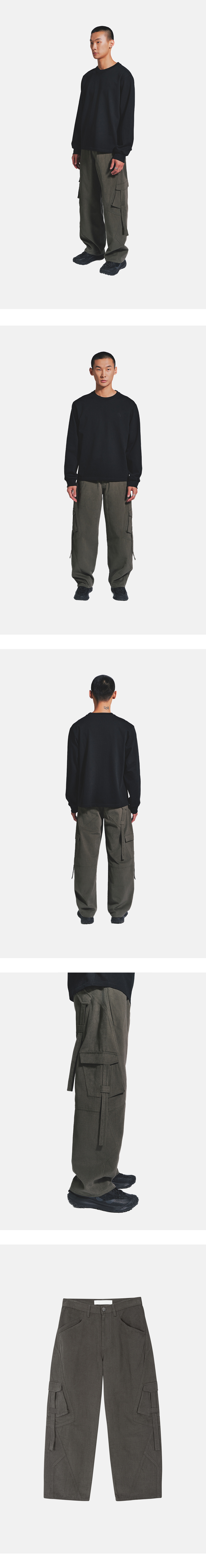 DETAILS * Olive green color * Wide fit * YKK zip fly * Side cargo pockets * Side and back pockets where the strap is secured and the opening is closed * HELIX CLOTHING embossed canton button 사계절 착용 가능한 부드러운 터치감의 코튼 팬츠입니다. 와이드 한 핏으로 제작되어 편안한 착용감을 제공하며 플라이 부분에 YKK 지퍼가 사용되었습니다. 스트랩을 결합하여 고정할 수 있는 포켓이 특징이며 사이드 카고 포켓에 입체 분량을 추가해 수납성을 높였습니다. The model is 182 cm tall and is wearing a size M.
