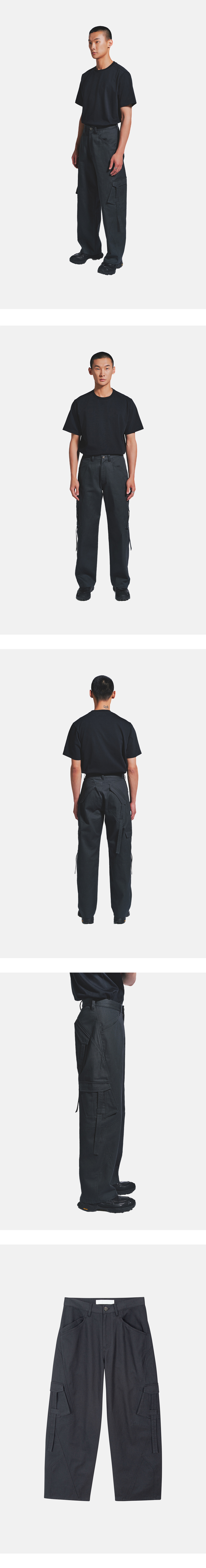 DETAILS * Teal gray color * Wide fit * YKK zip fly * Side cargo pockets * Side and back pockets where the strap is secured and the opening is closed * HELIX CLOTHING embossed canton button 사계절 착용 가능한 부드러운 터치감의 코튼 팬츠입니다. 와이드 한 핏으로 제작되어 편안한 착용감을 제공하며 플라이 부분에 YKK 지퍼가 사용되었습니다. 스트랩을 결합하여 고정할 수 있는 포켓이 특징이며 사이드 카고 포켓에 입체 분량을 추가해 수납성을 높였습니다. The model is 182 cm tall and is wearing a size M.