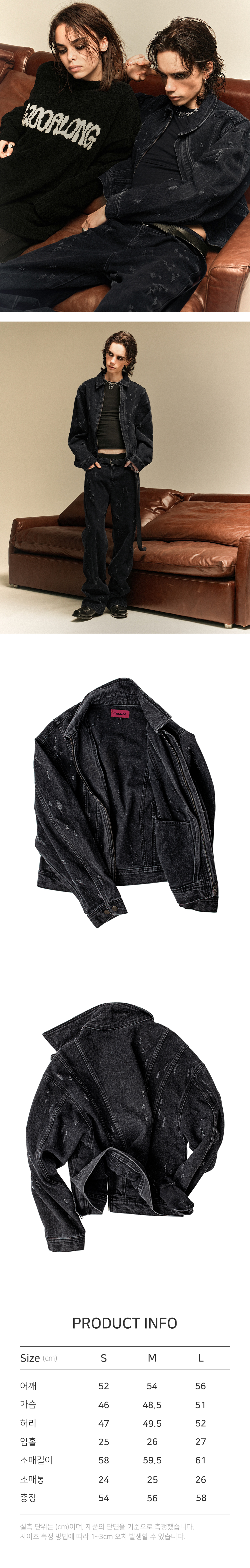 슬러그 데미지와 절개라인이 빈티지한 연출을 주는 데님 집업 자켓 FEATURE - 드롭 숄더의 크롭 실루엣 - 슬러그 데미지 - 전면 절개라인 - 전면 지퍼 히든 플라켓 - 슬러그 데미지 데님 팬츠와 셋업