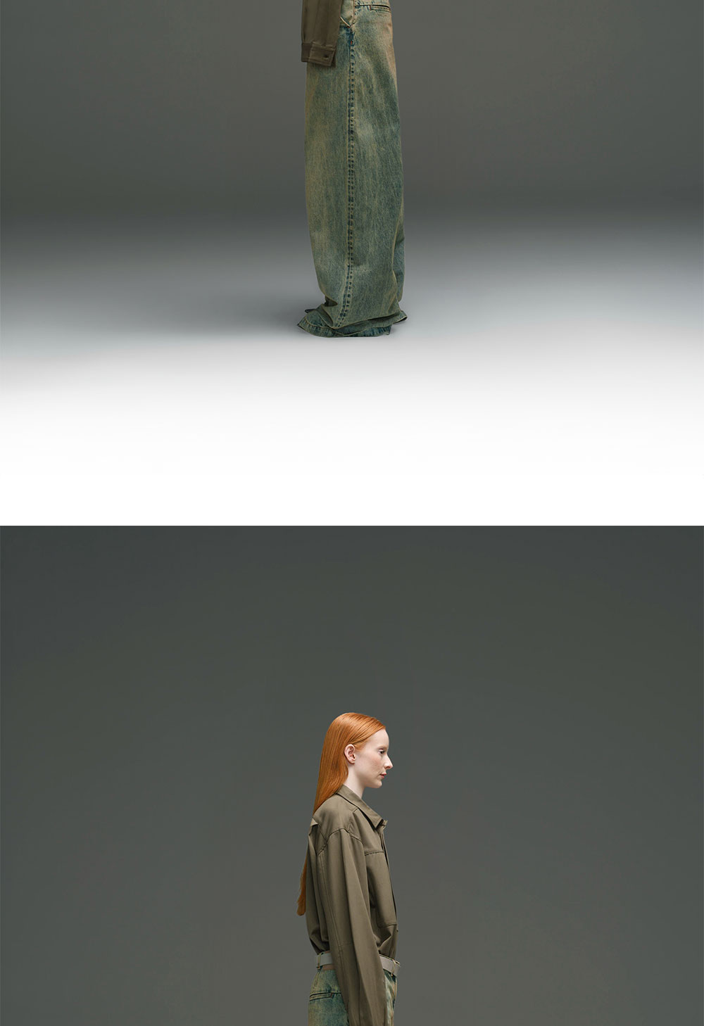 엔타이어 스튜디오만의 빈티지한 색감이 돋보이는 뎀 진입니다. - 여성용 와이드 핏 - 일본산 셀비지 데님 | 사이즈 가이드 | - 모델: 175cm - 착용 사이즈: S