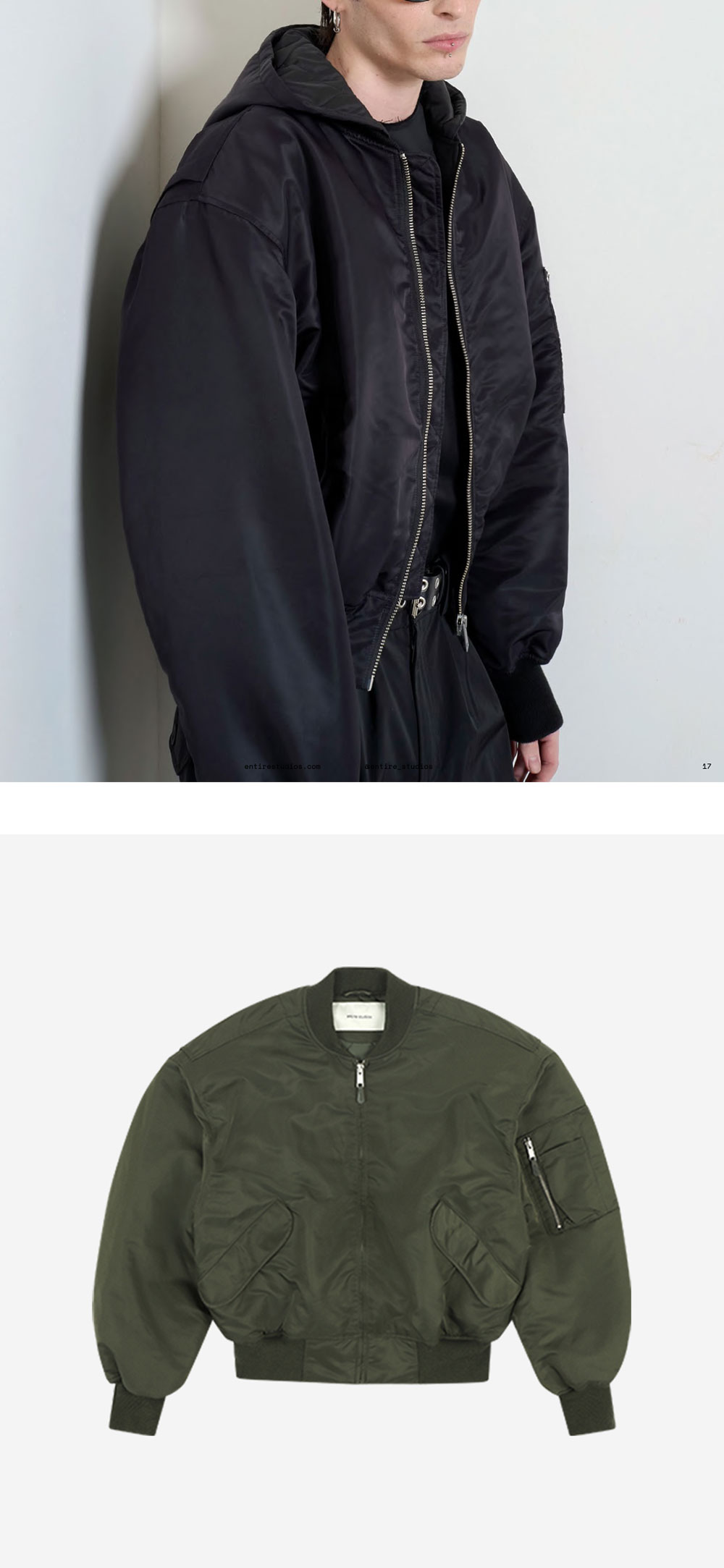 골반까지 오는 크롭한 핏에 오버사이징으로 봄버 자켓의 볼륨감을 더한 엔타이어 스튜디오의 브로드 봄버입니다. - 100% 나일론 새틴 - 전면의 플랩 포켓, 소매의 지퍼 포켓 *상세 이미지 내 모델이 착용한 컬러의 경우, 동일한 상품의 타 컬러인 점 참고 부탁드립니다.