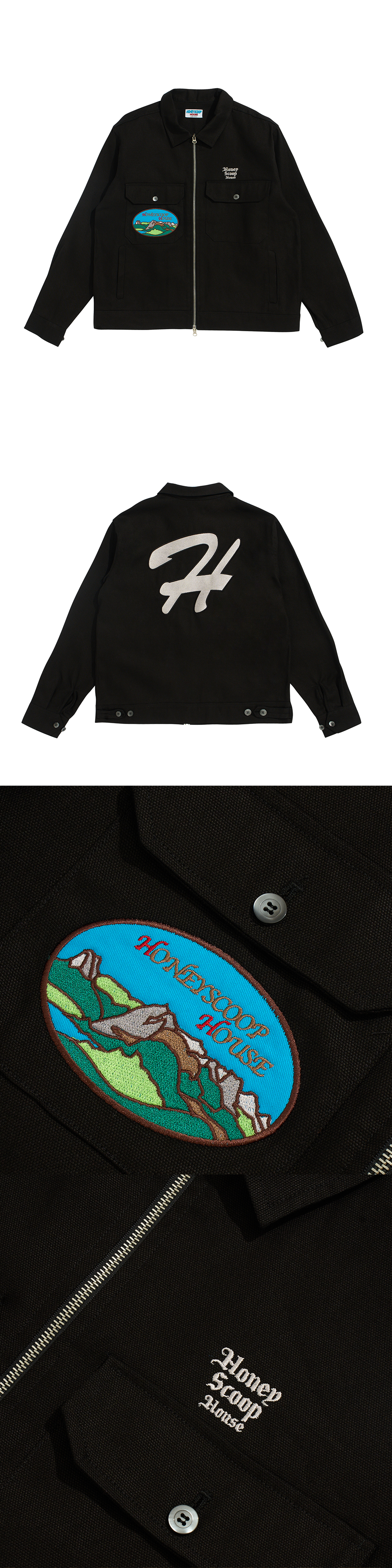 HONEY SCOOP HOUSE MOUNTAIN WORK JACKET BLACK 100% COTTON MOUNTAIN PATCH ON RIGHT CHEST POCKET OE LOGO EMBROIDERY ON LEFT CHEST H LOGO EMBROIDERY ON THE BACK UNISEX RELAXED FIT