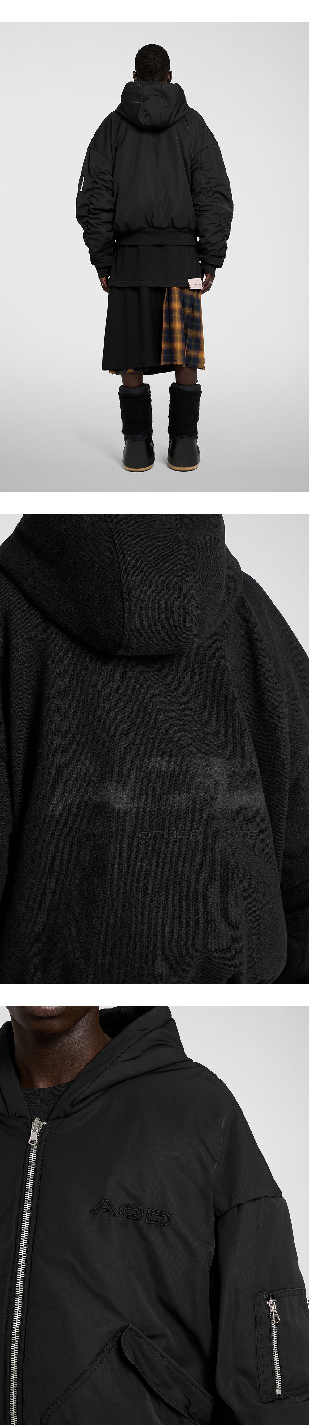 코튼 소재의 후디와 나일론 소재의 봄버 자켓 두 가지 스타일로 활용 가능한 AOD의 리버서블 나일론 코튼 봄버입니다. - 후디 후면의 빈티지 로고 프린팅 - 봄버 전면의 맥시한 플랩 포켓