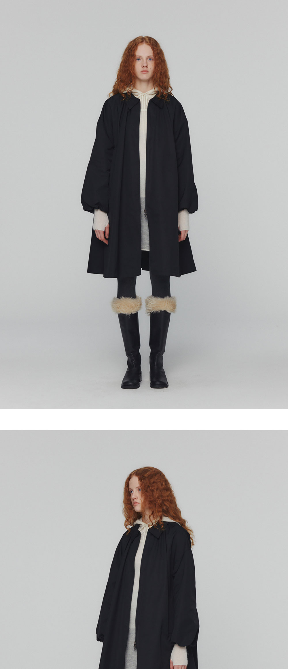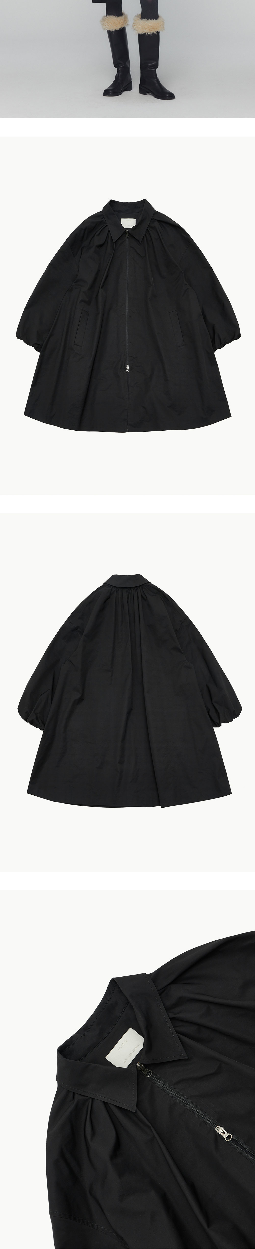 셔링 볼륨 디테일로 자연스러운 A라인 실루엣이 연출 되는 긴 기장감의 간절기 아우터입니다. - 오버사이즈 드레스 점퍼 - 목선과 어깨의 셔링 디테일 - 투웨이 지퍼