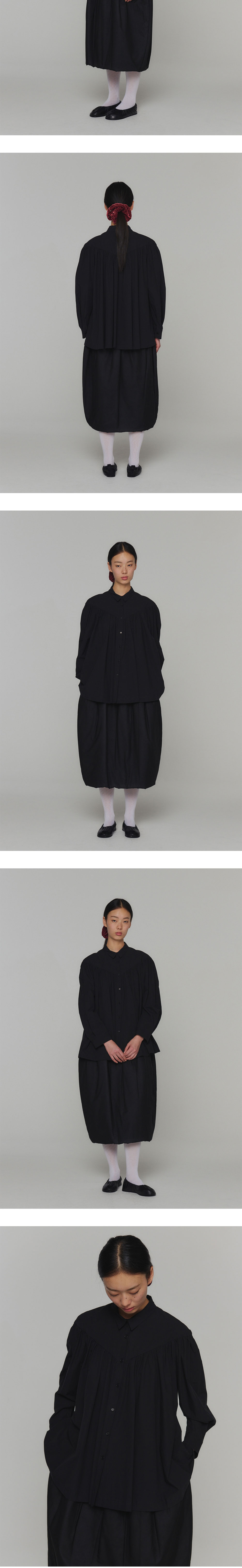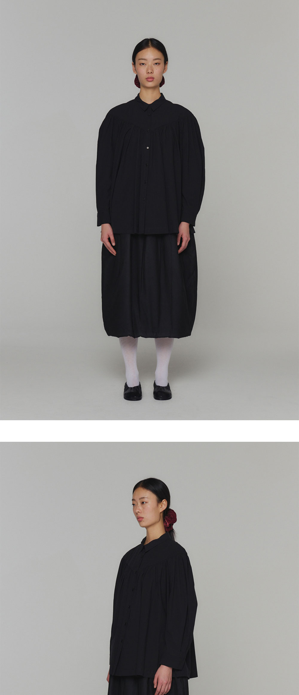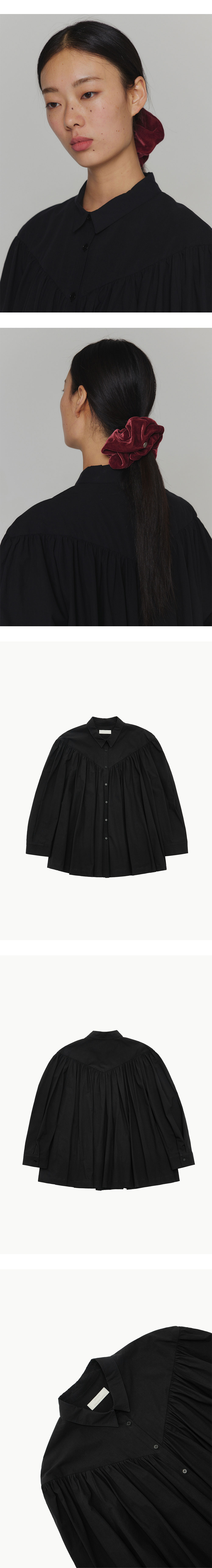 V 라인의 요크 절개 아래 풍성한 셔링이 돋보이는 아모멘토의 요크 셔링 셔츠입니다. - 시어 코튼 소재 - 두 개의 턱 디테일로 볼륨감 있는 소매