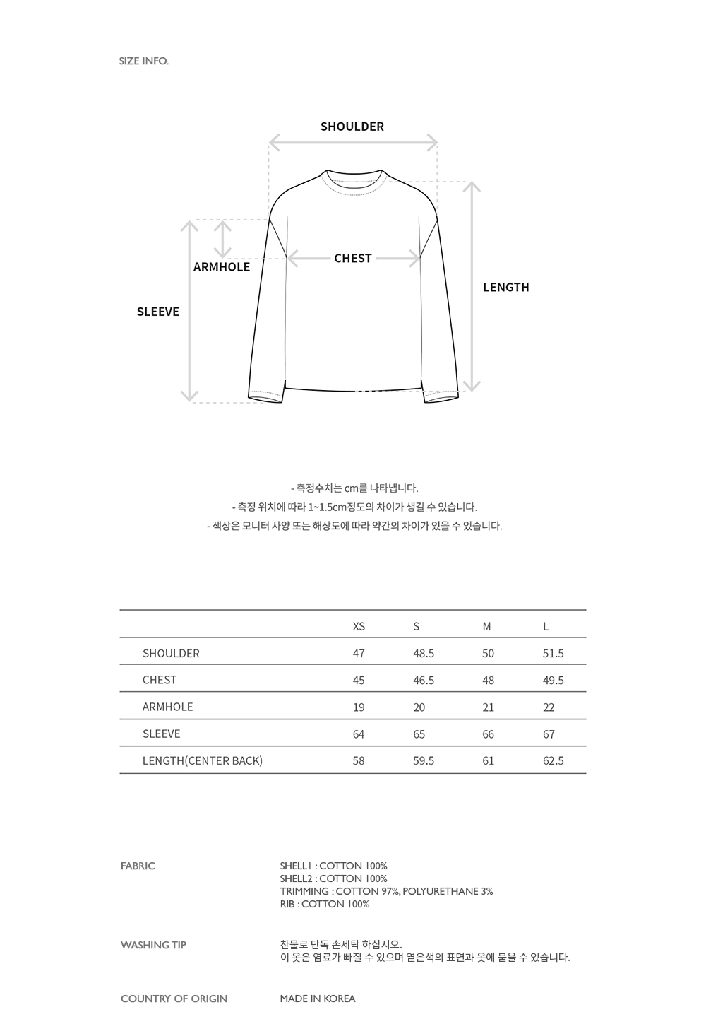 | 총장 | 어깨너비 | 가슴너비 | 암홀 | 소매길이 |