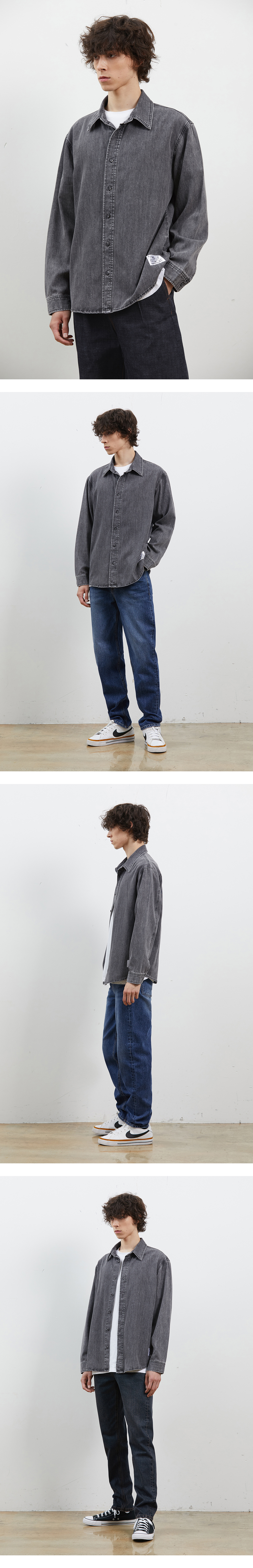 -CORK DENIM COLLABORATION COLLECTION 상품입니다. 세미 오버핏의 베이직한 셔츠입니다. 낙낙한 실루엣으로 이너용, 레이어드용 으로 다양하게 활용하기 좋은 셔츠입니다. 톤다운된 스톤워싱 그레이 컬러로 어디에나 코디할 수 있는 제품입니다.