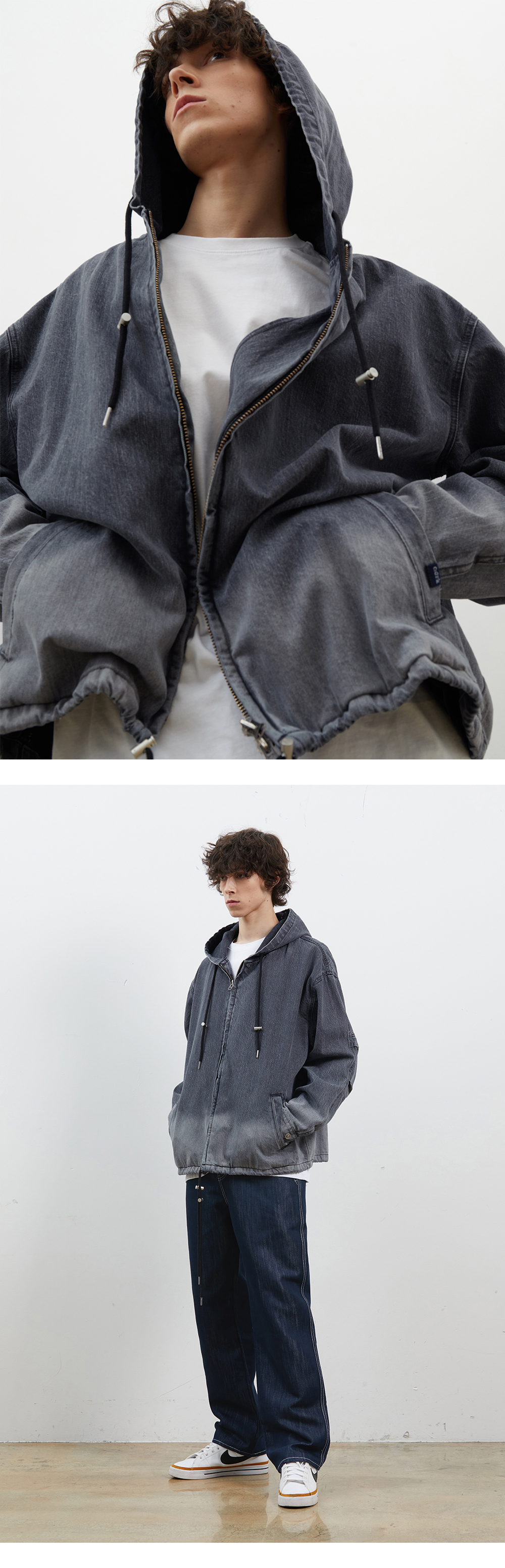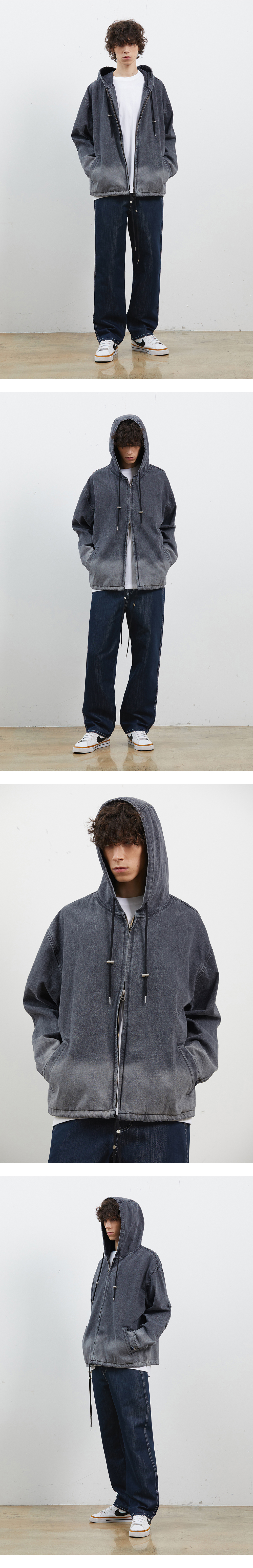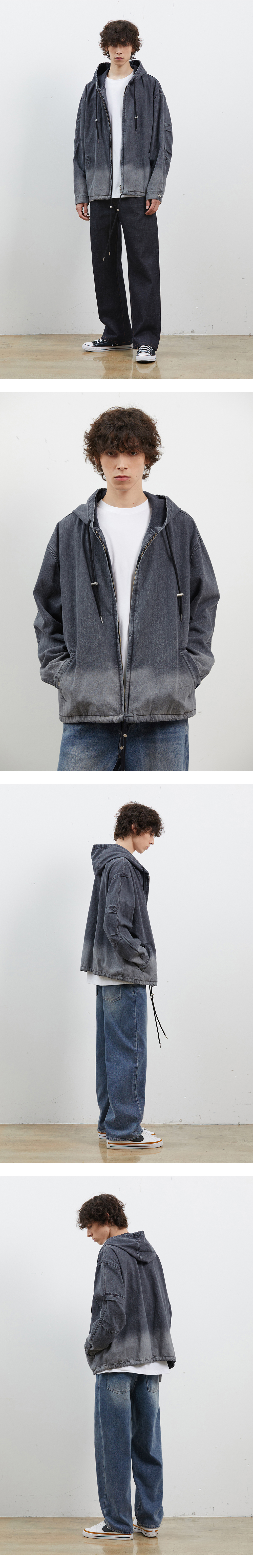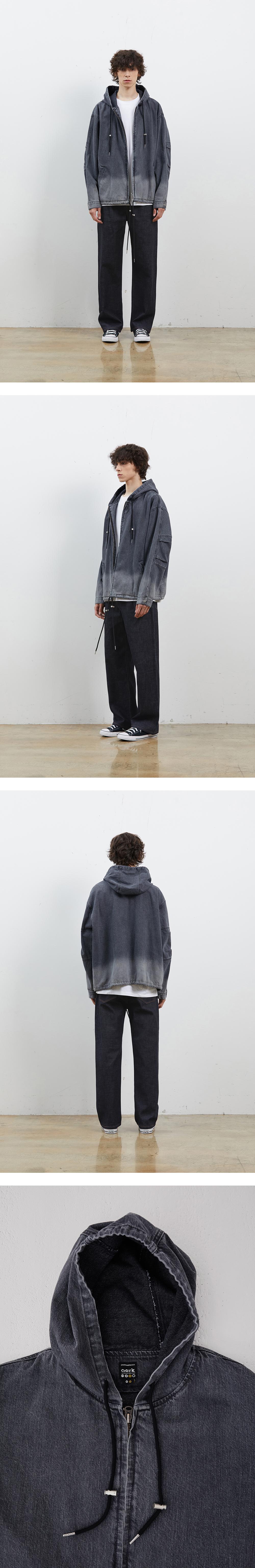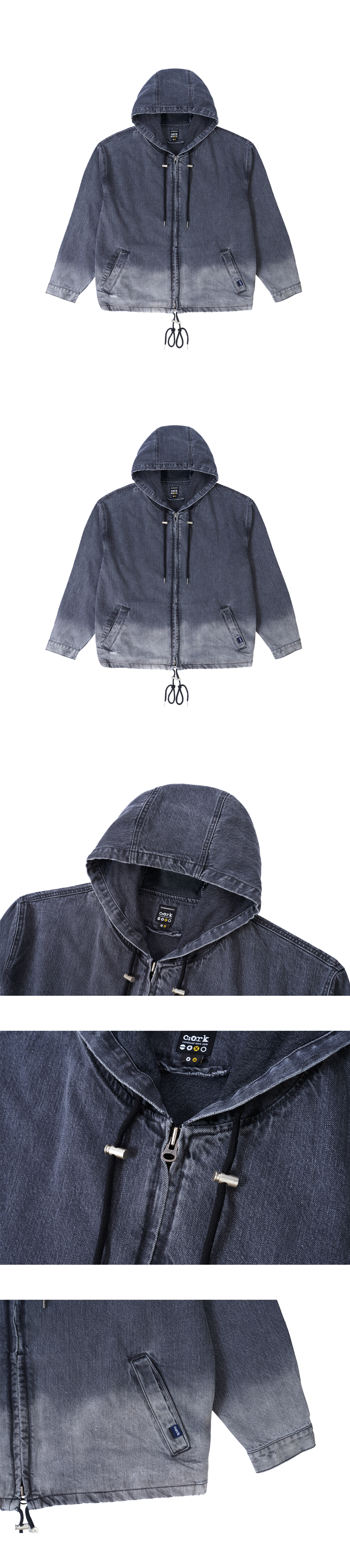 -CORK DENIM COLLABORATION COLLECTION 상품입니다. 트렌디한 오버핏 실루엣의 후드 데님 점퍼입니다. 소매에 투턱 디테일을 더해 활동성이 좋은 제품입니다. 전체적으로 그라데이션 된 컬러감으로 유니크함을 보여줍니다.