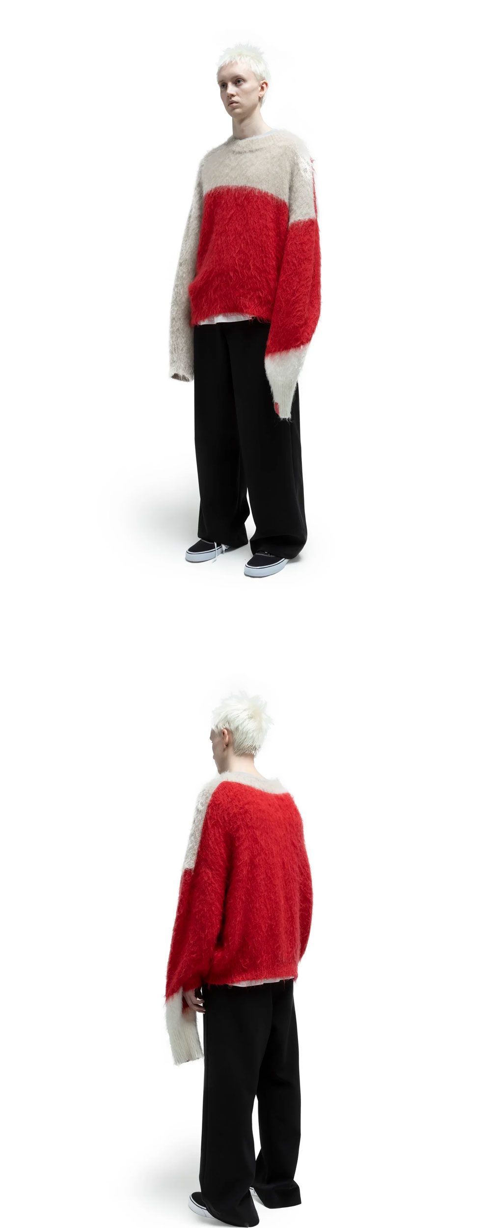 왜곡된 패턴으로 독특한 실루엣을 연출할 수 있는 후미토 간류의 모헤어 니트입니다. - 오버 핏 - 왜곡된 패턴이면서도, 착용 시 안정감을 고려하여 제작됨 - 길이가 긴 좌측 소매는 손을 뺄 수 있는 슬릿 존재