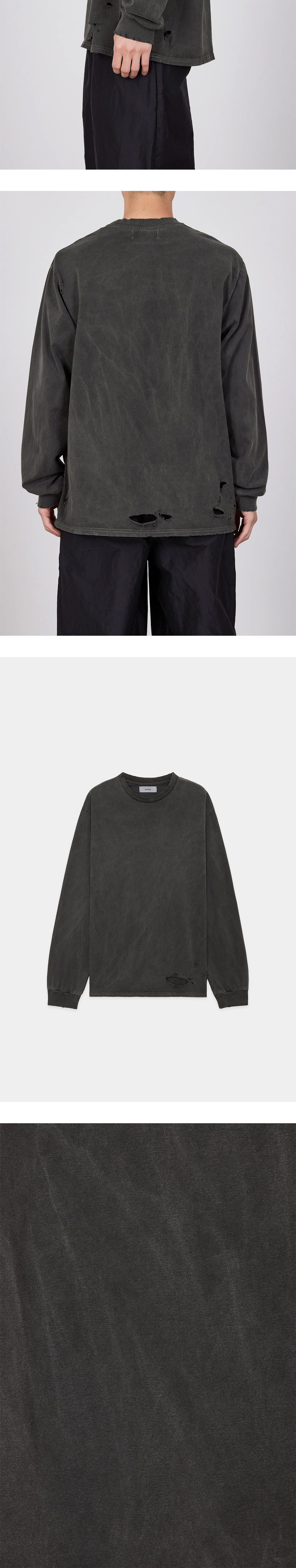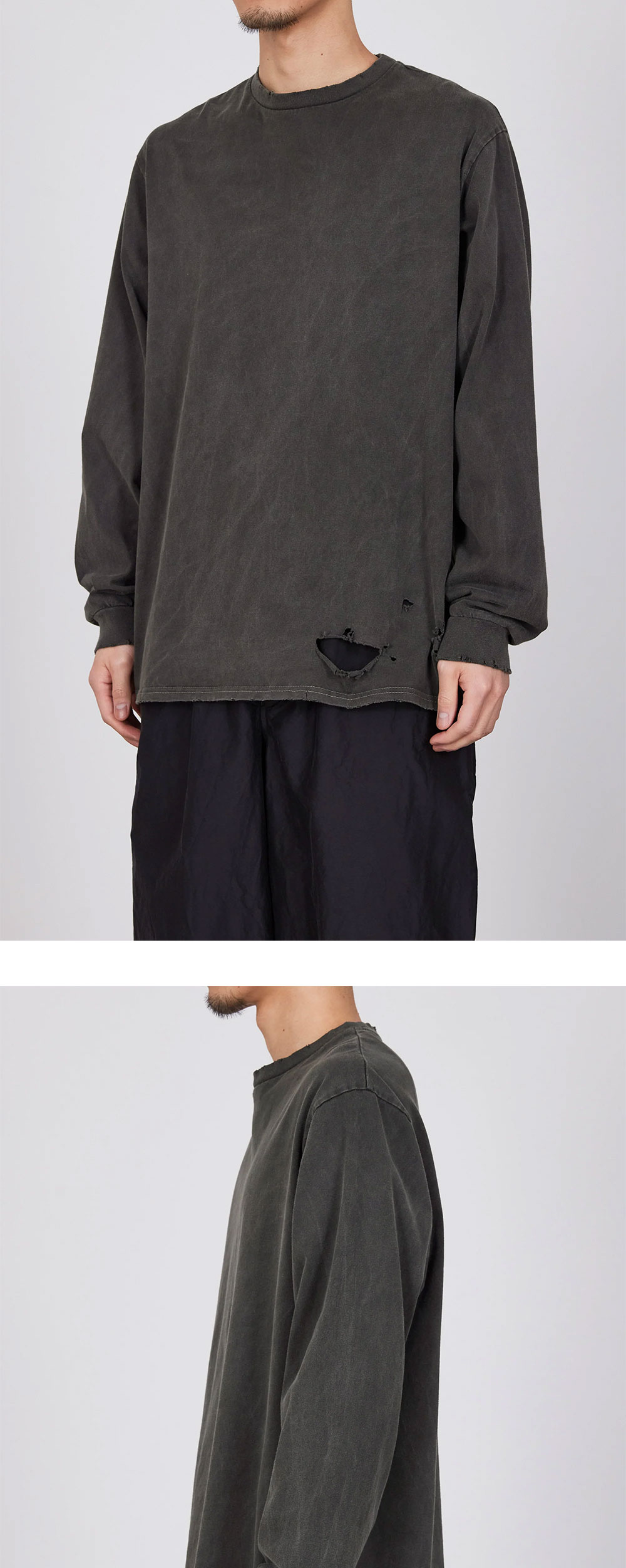 물 빠진 듯한 컬러와 데미지 디테일이 매력적인 마카의 롱슬리브 티셔츠입니다. - 레귤러 핏 - 블랙 컬러의 피그먼트 염색 - 넥라인, 소매, 밑단 등에 적용된 데미지 처리